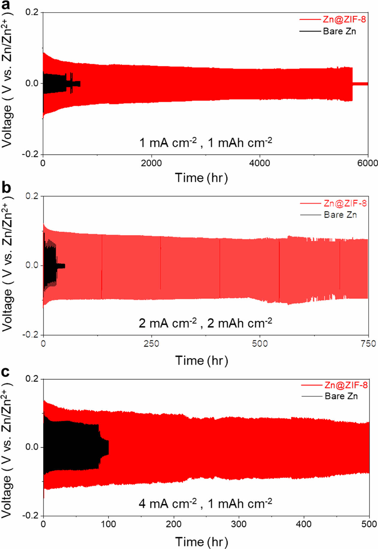 Zn@ZIF-8 사이클 특성 평가. ZIF-8 코팅층에 의해 억제 된 부반응 및 균일한 이온 수송은 아연 음극의 전기 화학적 성능을 크게 향상시킬 것으로 예상된다. 먼저, 다양한 전류 밀도 및 용량에서 대칭 셀 기반 테스트를 수행한 결과 일반적인 아연 음극의 경우 1 mA cm-2, 1 mAh cm-2 조건에서 약 400시간 후 갑작스러운 전압 감소를 나타냈다. 이와 대조적으로, Zn@ZIF-8 음극은 5500시간 이상 사이클 수명이 연장되어 일반적인 아연 음극보다 약 11배 더 긴 수명을 보여주었다(Figure 6(a)). 또한 더 빠른 전류밀도 2 mA cm-2, 2 mAh cm-2 조건과 4 mA cm-2, 1 mAh cm-2 조건에서도 일반적인 아연 음극보다 훨씬 더 우수한 사이클 안정성을 나타냈다(Figure 6(b,c)).