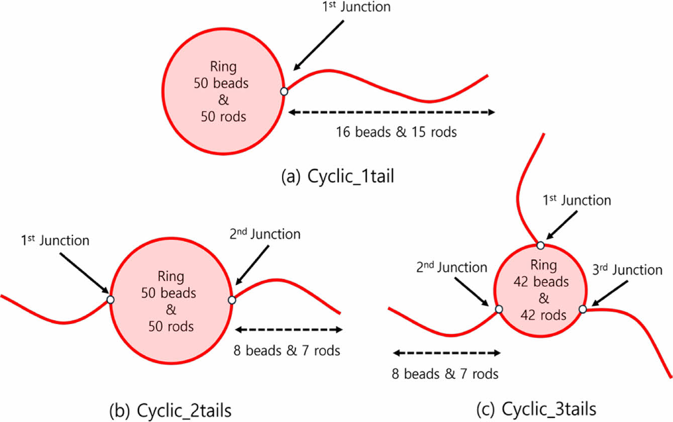 Figure 1에서 보듯이, 세 가지 올가미형 고분자를 구성하는 전체 비드 수는 66개이며 각 시스템에 따라 고리형 백본(ring backbone)과 선형 곁가지(linear side branch) 부분에 속한 비드 수가 달라진다. 먼저, 50개의 비드로 구성된 고리형 백본에 16개의 비드로 구성된 선형 곁가지가 결합된 고분자 체인을 ‘cyclic_1tail’ 고분자 체인이라고 표기하였고(Figure 1(a)), 50개의 비드로 구성된 고리형 백본 양쪽에 8개의 비드로 구성된 두 개의 선형 곁가지가 결합된 고분자 체인을 ‘cyclic_2tails’ 고분자 체인이라고 표기하였다(Figure 1(b)). 마지막으로 42개의 비드로 구성된 고리형 백본을 따라 일정 간격으로 8개의 비드로 구성된 세 개의 선형 곁가지가 결합된 고분자 체인을 ‘cyclic_3tails’ 고분자 체인이라고 표기하였다(Figure 1(c)). 전단 유동 하에서 선형 폴리에틸렌(linear polyethylene)의 경우 하나의 비드(bead)는 대략 6개의 CH2 원자에 해당한다고 알려져 있다.53 따라서, 현재 비드-로드 모델(bead-rod model)을 이용한 올가미형 고분자 체인의 고리형 백본(ring backbone)은 C300H600과 같고 선형 곁가지 부분(linear branch)은 C96H193개의 분자량과 같으며, 전체적으로 C396H793의 분자량과 같다.