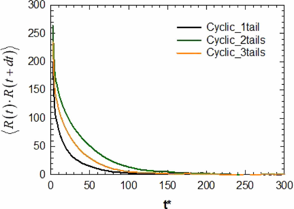Figure 2에서 보듯이, 각 올가미형 고분자 체인 시스템의 가장 긴 완화 시간(longest relaxation time)은 체인의 회전반경(chain radius of gyration)의 시간 상관 관계 함수(time correlation function, TCF)를 이용하여 계산하였다. 일반적으로 고분자 체인 시스템의 가장 긴 완화 시간은 체인의 종단 간 거리 벡터(chain end-to-end vector)나 체인의 회전반경(chain radius of gyration)의 시간 상관 관계 함수를 지수 붕괴 함수(exponential decay function)를 이용하여 추정할 수 있다. 하지만, cyclic_ 3tails 고분자 체인의 경우 종단 간 거리 벡터를 정의하기 어렵기 때문에 완화 시간을 계산하는데 체인 회전반경의 상관 관계 함수를 이용하였다. Cyclic_1tail 고분자 체인의 가장 긴 완화 시간은 14.53이고 cyclic_2tails 고분자 체인의 가장 긴 완화 시간은 33.00이며, cyclic_3tails 고분자 체인의 가장 긴 완화 시간은 23.04이다. 특히, 같은 비드 수의 고리형 백본을 가진 cyclic_1tail 고분자 체인과 길이와 cyclic_2tails 고분자 체인을 비교해 보면 선형 고분자의 배치에 따라 완화 시간이 2배 정도 차이 난다는 사실을 알 수 있다.