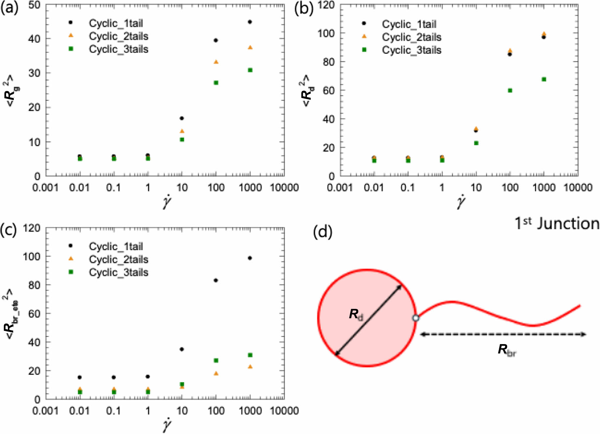로 나타내었고, 선형 곁가지의 크기는 곁가지 부분의 종단 간 백터 <Rbr>로 나타내었다. 먼저, 같은 고리형 백본을 가진 cyclic_1tail 고분자 체인과 cyclic_2tails 고분자 체인의 <Rd2>를 비교해 보면 전체 전단율 영역에서 둘은 매우 유사한 값을 가짐을 알 수 있다. 이는 cyclic_1tail 고분자 체인과 cyclic_2tails 고분자 체인의 고리형 백본 부분이 전단 유동 하에서 매우 유사하게 변형되고 있음을 의미한다. 하지만, 같은 전단 세기에서 cyclic_1tail 고분자 체인과 cyclic_2tails 고분자 체인의 <Rg2> 값은 같지 않음을 알 수 있다. Figure 3(c)에서 볼 수 있듯이, 같은 전단율에서 cyclic_2tails 고분자 체인의