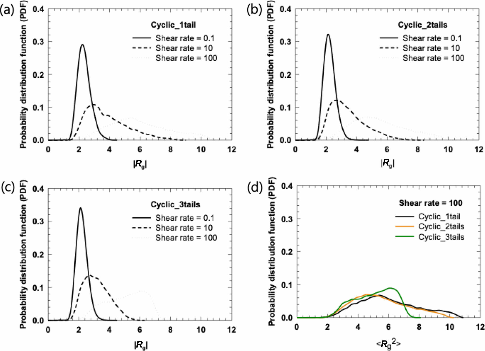 함수를 보여주고 있다. 전단 유동 세기가 증가함에 따라 각 올가미형 고분자 체인의 |Rg| PDF는 전형적인 가우스 분포 함수로부터 변형된다. Figure 4에서 볼 수 있듯이 각 올가미형 고분자 체인의 |Rg| PDF는 낮아지게 되고 폭은 넓어지게 되며 피크는 더 높은 |Rg|값으로 이동해 나간다. 이러한 변화는 전단 유동에 의한 ‘체인 스트레칭 및 흐름 방향 정렬’과 ‘체인 텀블링 및 회전 메커니즘’과 밀접한 연관을 맺고 있다.