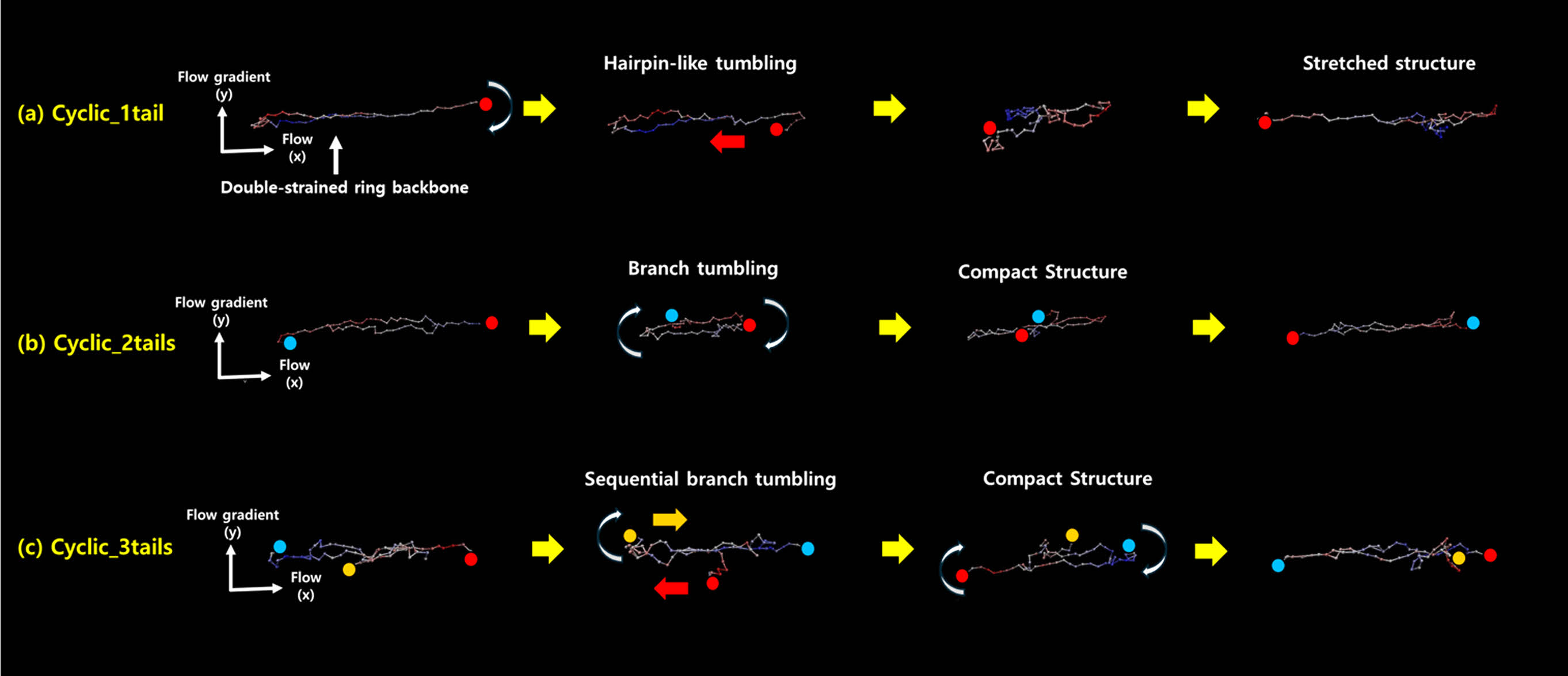 에서 고리형 고분자 체인의 각 사이드가 서로 접근하여 이중 가닥(double-strained)으로 이루어진 선형 구조를 만든다고 한다.55 그 결과, 고리형 고분자 체인은 단일 가닥(single-strained)으로 이루어진 선형 고분자 체인과 비슷한 체인 텀블링 및 회전을 보여준다. 이전 연구에서 자유 배수 용액 하 순수 고리형 고분자 체인은 선형 고분자 체인과 비슷한 S자 텀블링(S-shape tumbling) 및 헤어핀 텀블링(hairpin tumbling)을 보여주었다.53,54