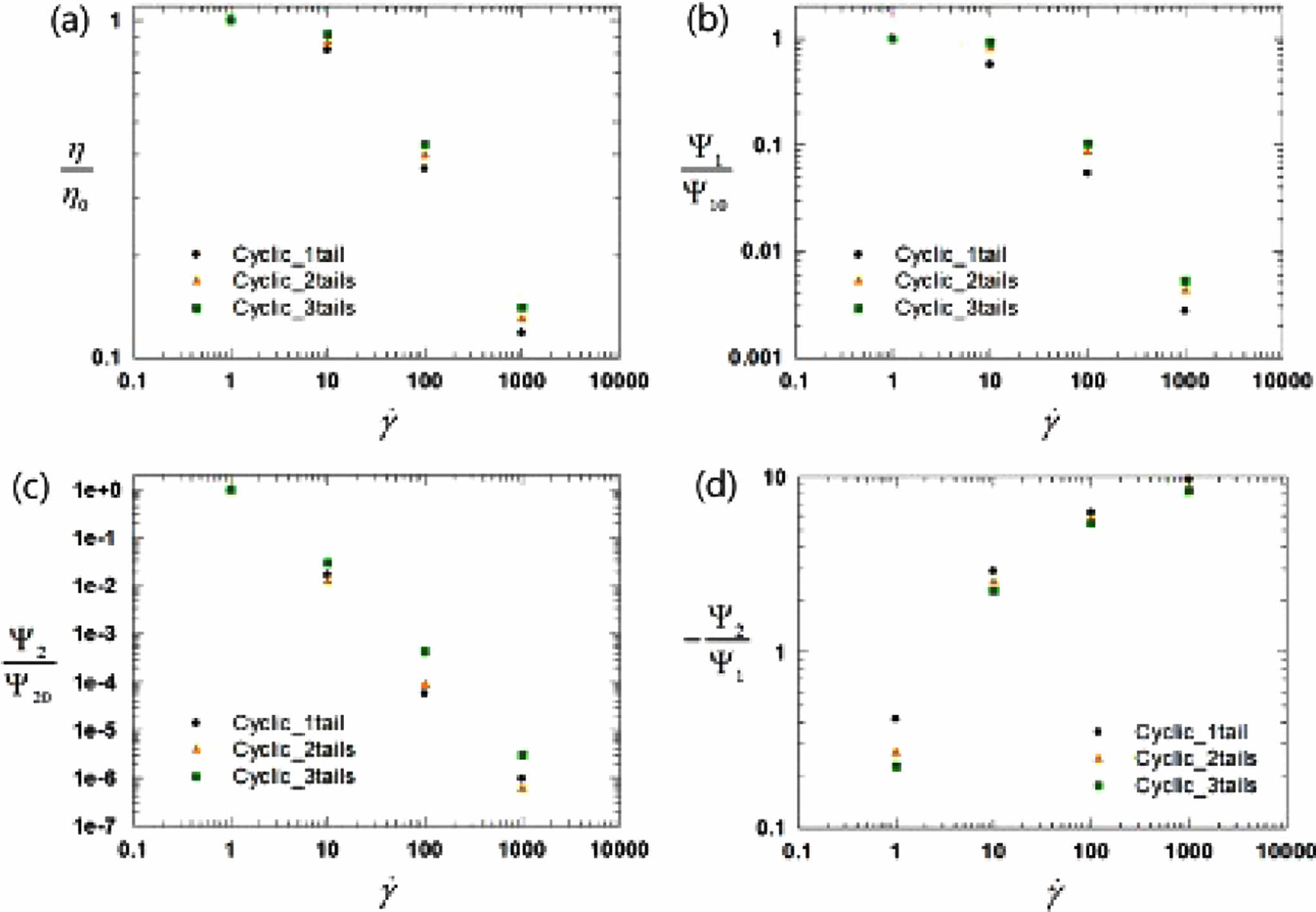 Figure 6(b)와 (c)는 1차 및 2차 수직 응력 계수(1st and 2nd normal stress coefficient, Ψ1/Ψ10와 Ψ2/Ψ20)를 전단율에 따른 함수로 나타냈다. 그림에서 보듯이 자유 배수 용액 하 각 올가미형 고분자 체인 시스템들은 전단율이 증가함에 따라 수직 응력 계수가 감소하는 전형적인 면찰 담화 거동(shear-thinning)을 보여주고 있다. Figure 6(a)의 점도와 마찬가지로 같은 전단율에서 cyclic_3tails 고분자 체인이 가장 큰 수직 응력 계수 값을 보여주고 있으며 cyclic_1tail 고분자 체인 시스템이 가장 작은 수직 응력 계수 값을 가진다. 이는 앞서 설명한 바와 같이 각 고분자 시스템의 유체역학적 형태 변화와 유변학적 거동에 기인한 것이라 생각할 수 있다.