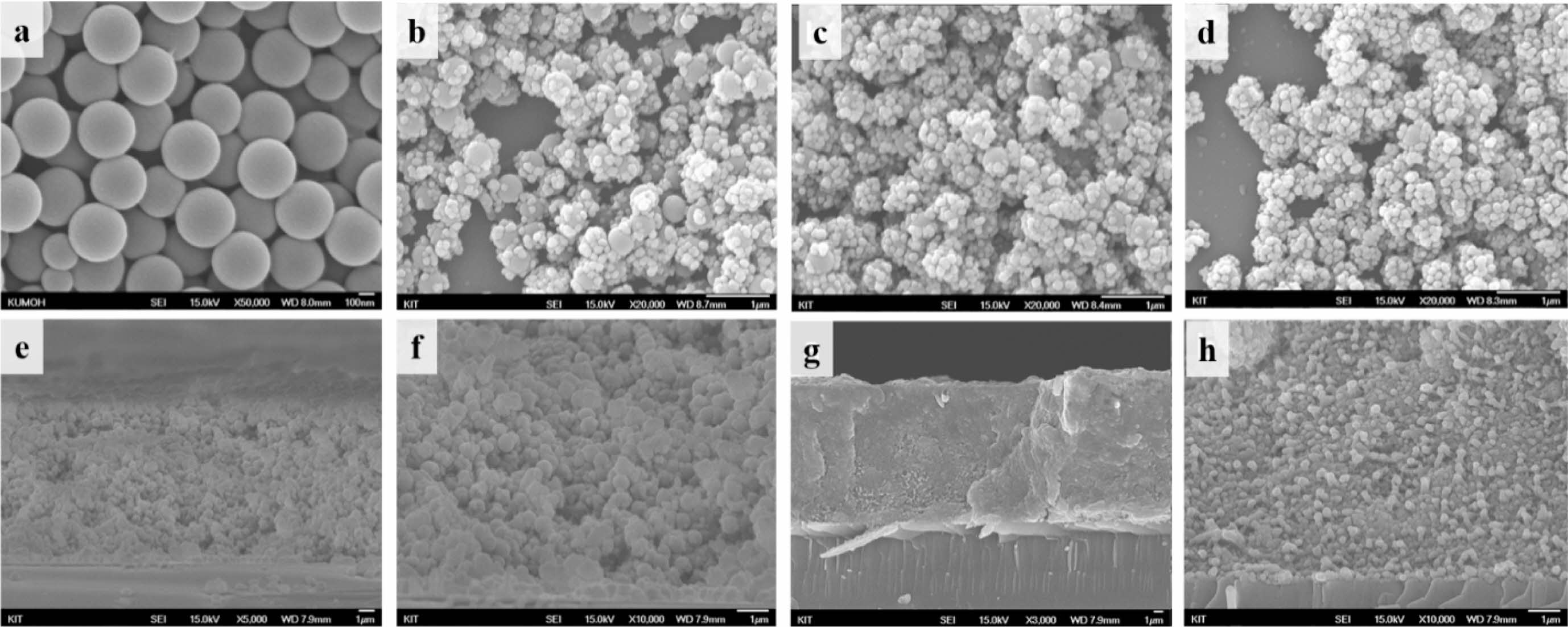 Figure 2 FE-SEM images of (a) synthesized PS particles; (b) PS@BT-1; (c) PS@BT-2; (d) PS@BT-3 composites (with PS:BT weight ratio of 1:1, 1:2, 1:3, respectively). Cross-section FE-SEM images of PS@BT-1 film; (e,f) before heat treatment; (g,h) after heating at 100 ℃ for 30 min. |