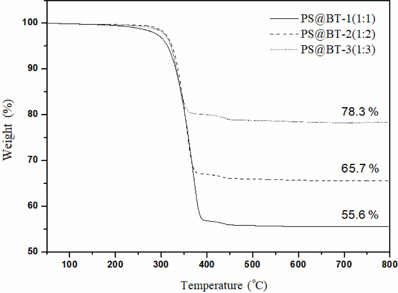 The mass of BT particles attached to the polystyrene surface was verified through thermogravimetric analysis (TGA) curves, as illustrated in Figure 3. During the heating process of the PS@BT nanocomposites, polystyrene, which possesses a lower decomposition temperature, decomposes initially, whereas the BT particles, with their higher thermal stability, remain intact. This differential decomposition behavior allows for precisely quantifying BT content within the composites. For the PS@BT-1, PS@BT-2, and PS@BT-3 samples, complete decomposition of the polystyrene matrix was observed at temperatures exceeding approximately 400 ℃. The final residues, which correspond to the remaining BT particles,24
