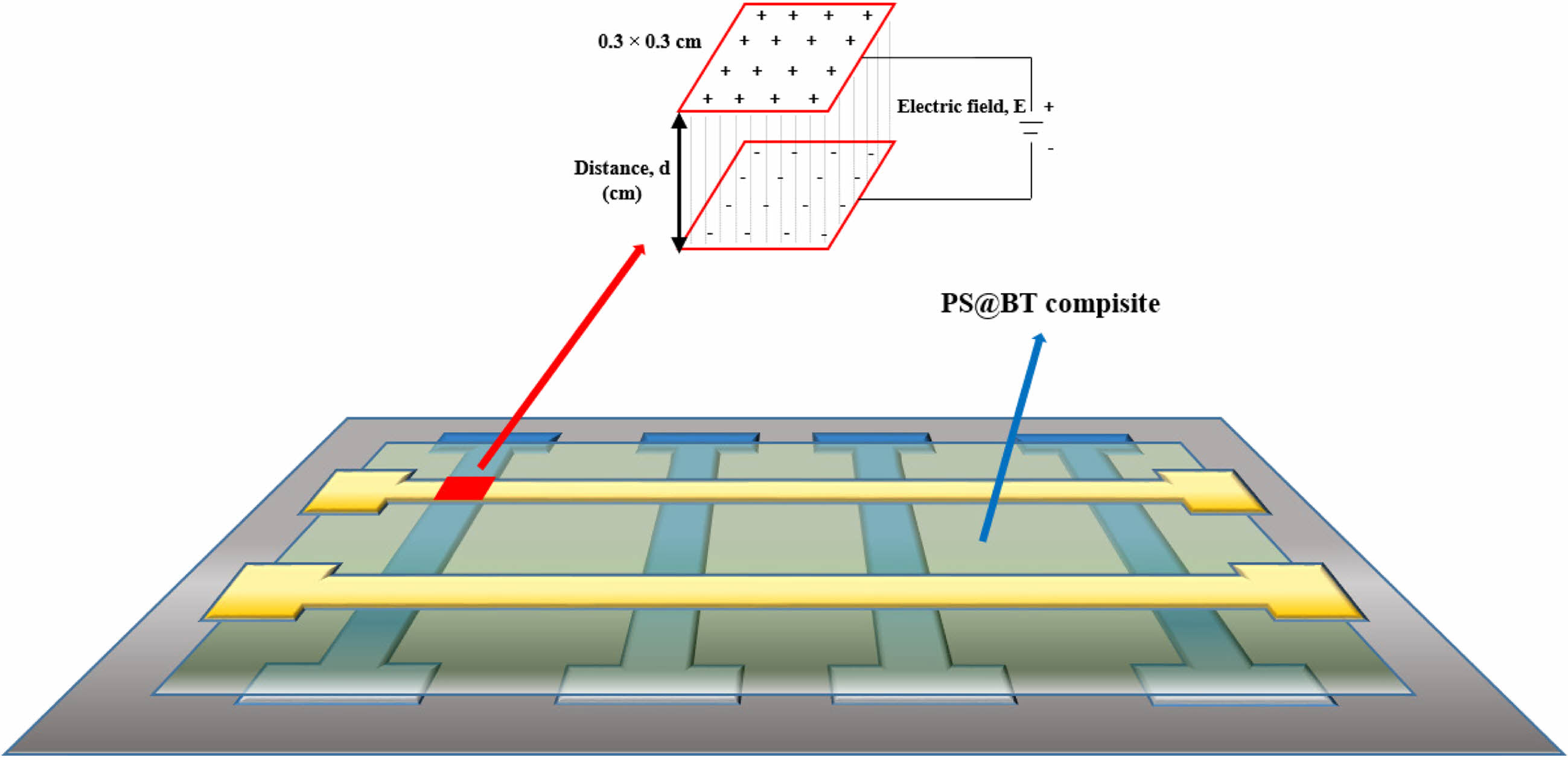 The initially rough surface of the PS@BT array (Figure 2(e)) was converted into a smooth surface in the composite film, as shown in Figure 2(g). A fully integrated PS@BT was achieved following the PS coating process. The devices were fabricated in parallel-type embedded capacitors to investigate the dielectric properties of PS@BT nanocomposites. The conducting electrodes on both sides were made of gold and had a thickness of 70 nm (Figure 4).