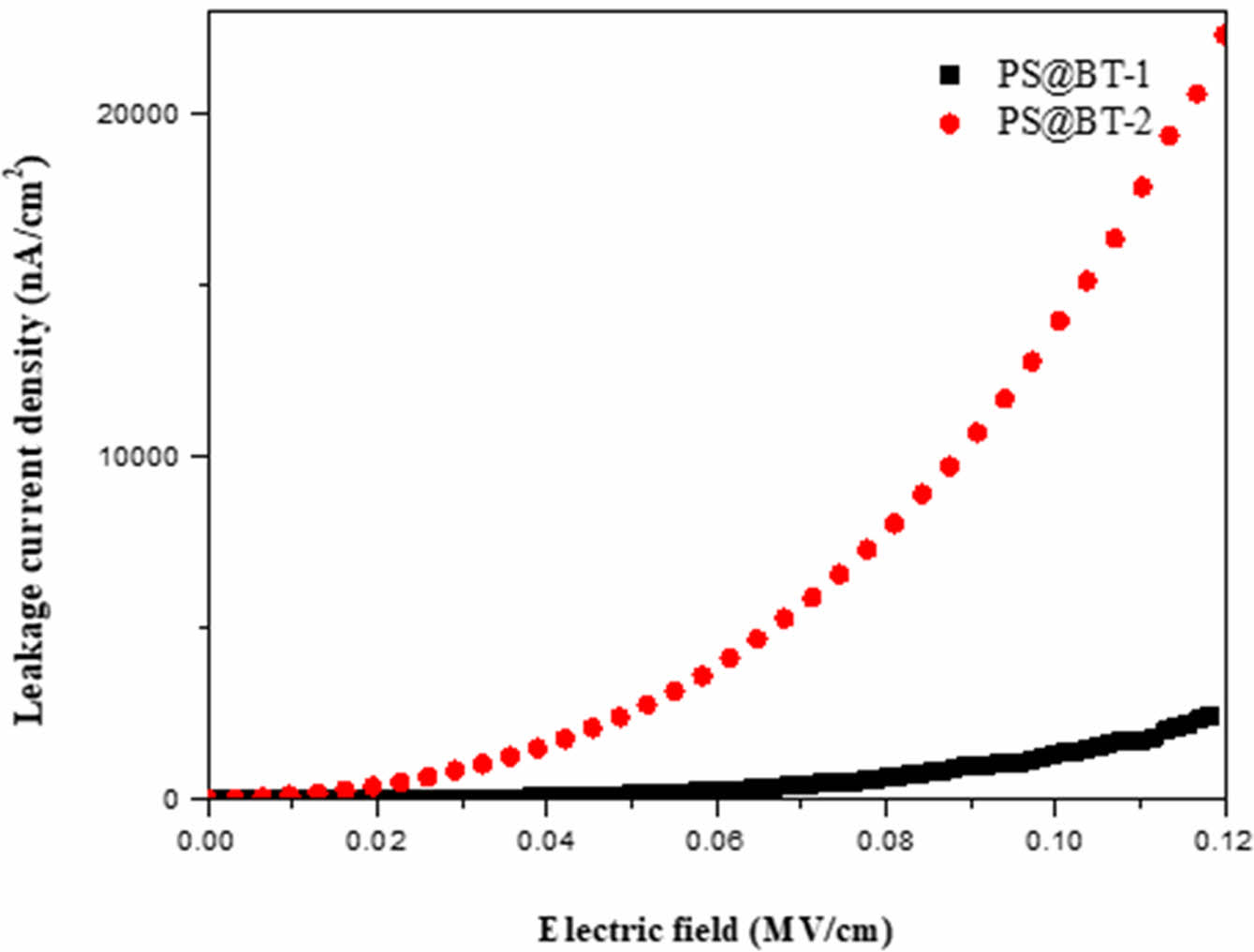 Figure 6 illustrates the leakage current density measurements for PS@BT nanoparticle films with increasing electric field. At 0.02 MV/cm, PS@BT-1 and PS@BT-2 exhibited 5.98 and 495.5 nA/cm2 values, respectively. The relatively higher BT content increased the leakage current value for PS@BT-2 nanoparticle film. It can be assumed that the surface interaction between BT nanoparticles influenced the development of the current pathway. From this, it is inferred that the percolation point is formed within this range of BT content due to the high BT concentration. In general, ceramics with high dielectric constant values exhibit high dielectric loss characteristics at high electric fields. Obtained dielectric loss values at 10 kHz were 0.02 and 0.02 for PS@BT-1 and PS@BT-2, respectively.
