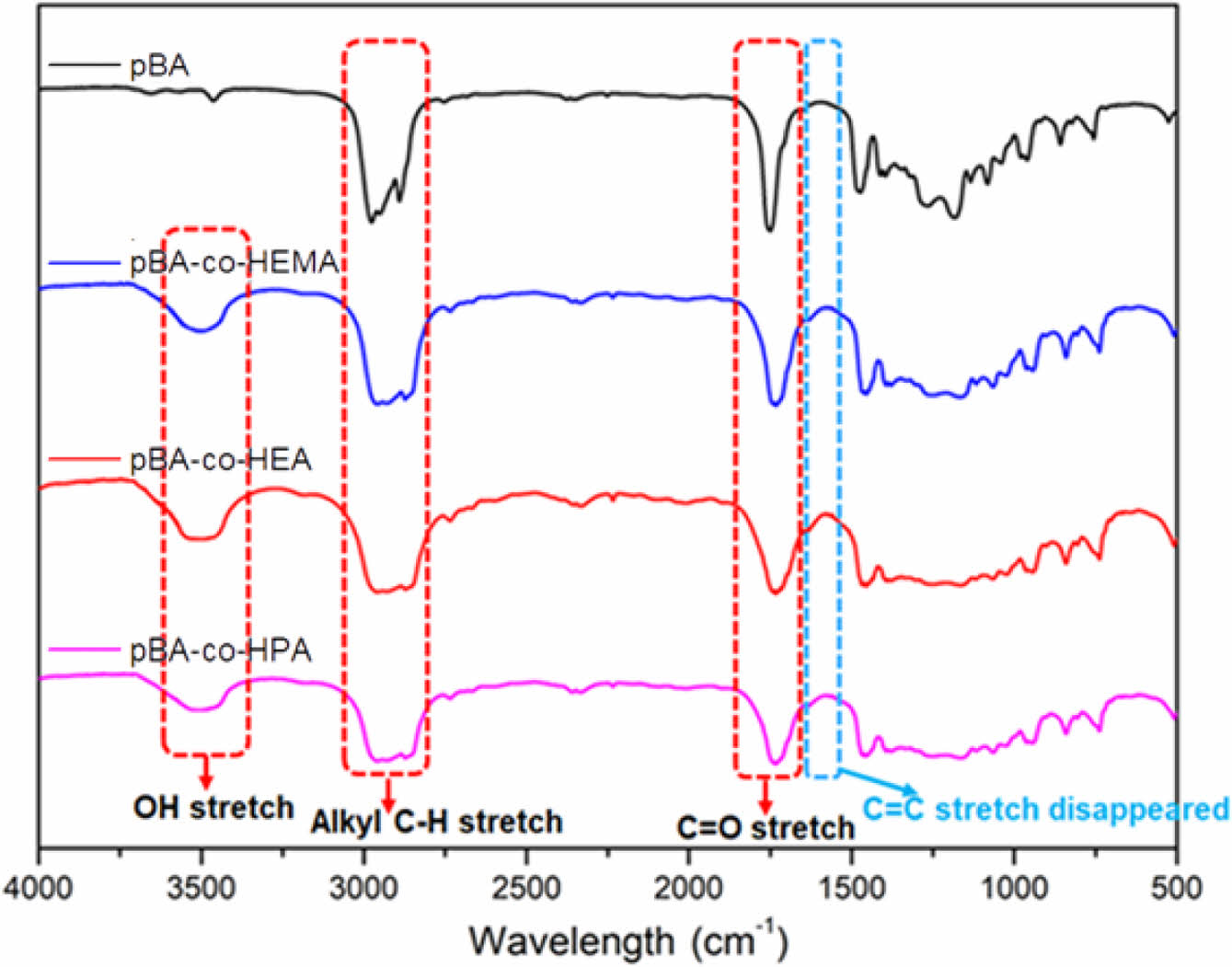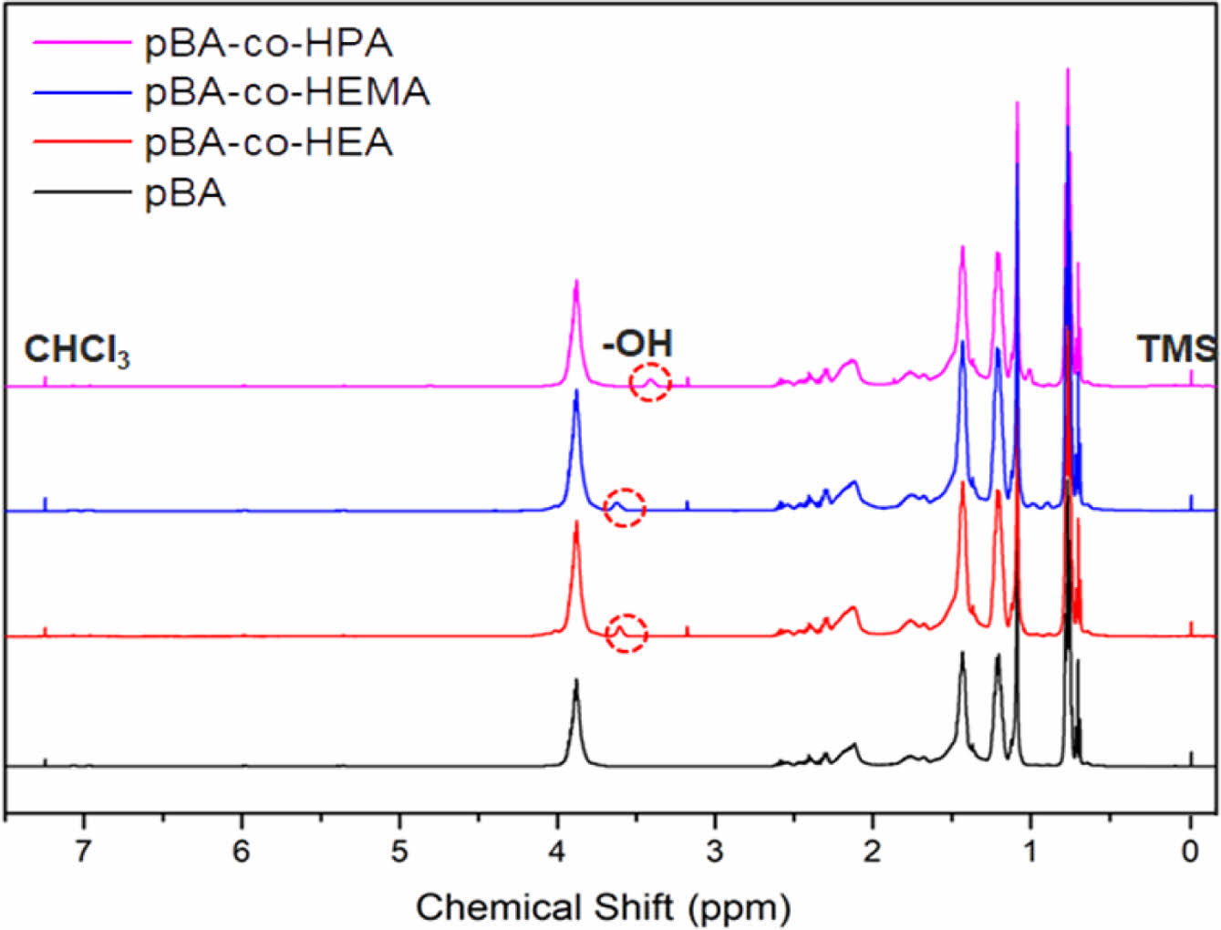 Poly(butyl acrylate) 및 Poly(butyl acrylate-co-hydroxy acrylate)의 합성. 본 연구에서는 수평균 분자량 1800 목표로 butyl acrylate를 기반으로 하여 다양한 수산기 함유 아크릴레이트 단량체(HEA, HEMA 및 HPA)를 사용하여 아크릴 올리고머를 중합하였으며, GPC를 사용하여 아크릴 올리고머의 분자량 및 PDI를, FTIR 그리고 1H NMR을 사용하여 화학 구조를 분석하였다.