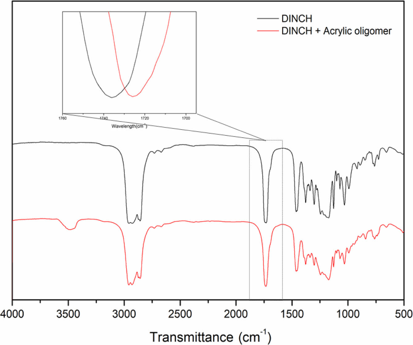 Figure 4 FTIR spectra of DINCH and (DINCH + p(BA-co-HPA), 90:10) mixture, respectively. |