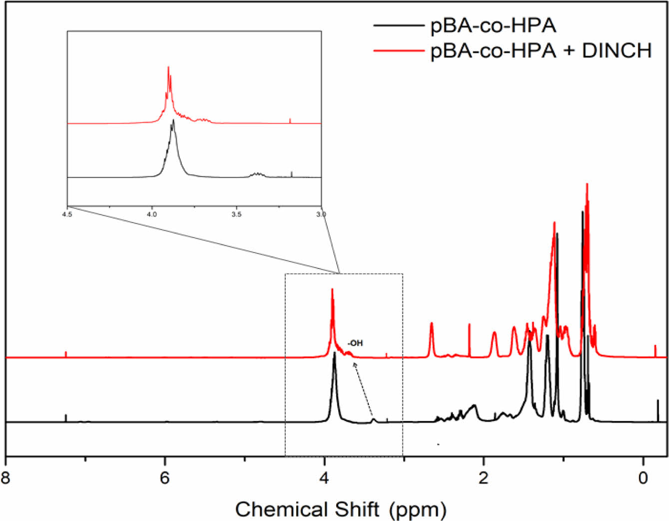 Figure 6 1H NMR spectra of p(BA-co-HPA) and (p(BA-co-HPA) + DINCH, 95:5) mixture, respectively |