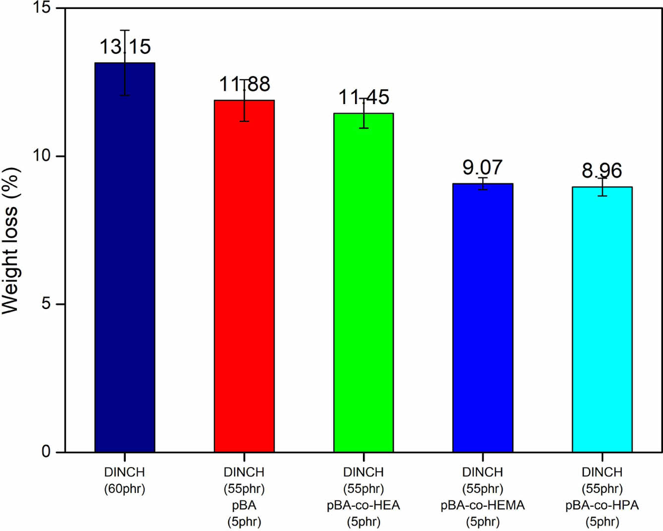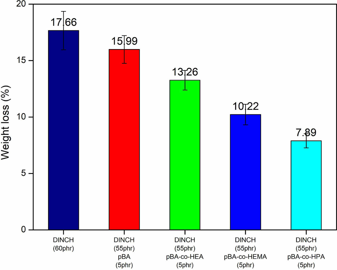 p-PVC 시편의 가소제 이행성 평가. Olive oil을 용매로 선정하고 본 연구에서 제작한 p-PVC 시편이 함유하고 있는 DINCH 가소제의 이행성 특성을 분석하였다. Figure 7에 DINCH 단독 및 다양한 아크릴 올리고머가 추가로 배합된 p-PVC의 용매 함침 후의 무게 감소율을 나타내었다. Olive oil에 의한 가소제 이행성 특성 분석 결과, DINCH/p(BA-co-HPA) (55 phr/5 phr) 배합물의 무게 감소율이 8.96%로 가장 낮은 수치를 보여주었고 DINCH(60 phr) 단독 사용보다 무게 감소율이 4.19% 감소하였다. 이는 상기의 FTIR 및 1H NMR 분석 결과와 마찬가지로 p(BA-co-HPA)의 –OH 관능기가 DINCH의 C=O 관능기와 수소결합을 이루어 DINCH 가소제의 내이행성이 증진된 것으로 추정된다.