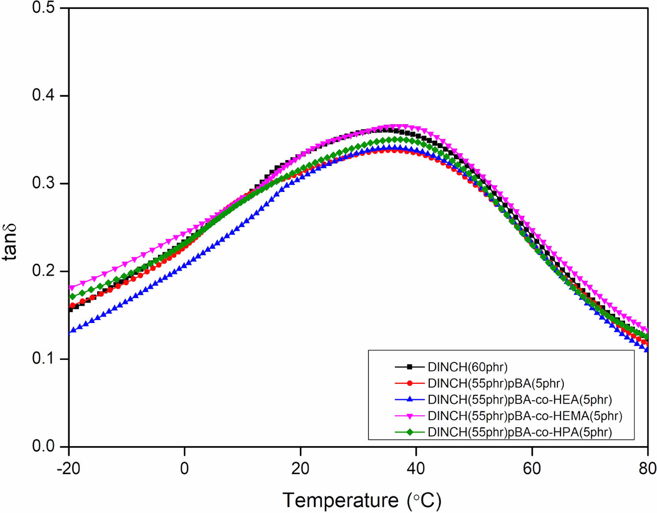 p-PVC 시편의 열적 특성 평가. 본 연구에서 제작한 p-PVC 시편을 이용하여 DMA 및 TGA 분석을 통해 열적 특성을 조사하였다. Figure 9에 p-PVC 시편의 온도 변화에 따른 DMA의 tanδ의 변화를 나타내었고 Table 3에는 다양한 p-PVC의 유리전이온도(Tg)의 수치를 나타내었다. DMA 분석 결과, 다양한 아크릴 올리고머는 소량 사용 시 PVC 배합물의 열적 특성에 크게 영향을 미치지 않았다. 이행성 특성 시험에서 가장 우수한 특성을 보여주었던 DINCH/p(BA-co-HPA) (55 phr/5 phr) 배합물이 DINCH 단독 사용 배합물보다 Tg가 약 2 ℃ 정도 상승하는 데 그쳤다.