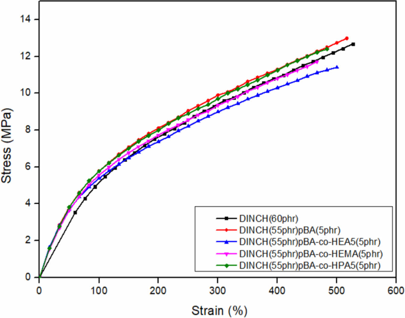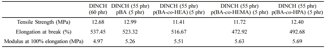 UTM 분석 결과, 본 연구에서 획득한 신규 아크릴 올리고머 4종이 소량(5 phr) 배합된 p-PVC의 연신율은 DINCH 단독 사용 PVC 시편보다 다소 감소되었으나, 인장 강도 및 탄성률은 크게 변하지 않은 것으로 관찰되었다. Figure 11에는 DINCH와 다양한 아크릴 올리고머가 배합된 p-PVC 시편의 stress-strain curve를 나타내었고, Table 5는 UTM 측정 결과치이다.