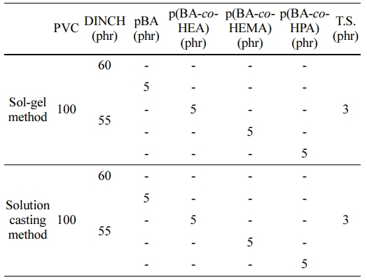 시약. 아크릴 올리고머의 합성에 사용된 단량체 중 butyl acrylate(BA, > 99.0%), 2-hydroxyethyl acrylate(HEA, > 97.0%), 2-hydroxyethyl methacrylate(HEMA, > 95.0%) 그리고 2-hydroxypropyl acrylate(HPA, > 95.0%)는 각각 Sigma-Aldrich(USA) 및 Tokyo Chemical Industry(일본)에서 구입하여 별도의 정제 과정을 생략하고 사용하였다. 개시제와 사슬이동제(chain transfer agent)인 2,2′-azobis(2-methylpropionitrile)(AIBN, > 98.0%) 및 1-dodecanethiol(> 98.0%)는 각각 삼전순약(한국) 그리고 Sigma-Aldrich(USA)에서, 그리고 반응 용매인 toluene(> 99.8%)과 분리정제 과정에 사용한 용매인 methanol(> 94.5%)은 삼전순약(한국)에서 구입하여 사용하였다. PVC 시편 제작(solution casting method 및 sol-gel method)에 사용된 PVC paste resin (KM-31)은 한화케미칼(한국)에서 구입하여 사용하였다. 그리고 tetrahydrofuran(THF)(> 99.9%)는 삼전순약(한국)에서, 열 안정제(thermal stabilizer, 이하 T.S.)는 송원산업(한국)의 BZ-101을 구입하여 사용하였다. 가소제인 DINCH는 BASF사(독일)에서 직접 입수하여 사용하였다.