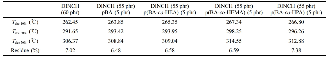 한편, DINCH와 다양한 아크릴 올리고머가 배합된 PVC 시편의 추가적인 열적 특성을 알아보기 위해 TGA를 이용하고 상온에서 600 ℃까지의 가열하면서 중량 손실을 조사하였다(Figure 10). DINCH/p(BA-co-HEMA)(55 phr/5 phr) 가소제 배합물 함유 PVC 시편의 열분해 온도가 가장 높게 측정되었다. 이행성 특성 분석에서 가장 우수한 결과를 보여준 DINCH/p(BA-co-HPA)(55 phr/5 phr) 가소제 배합물 함유 PVC 시편은 DINCH/p(BA-co-HEMA)(55 phr/5 phr) 배합물 시편보다 다소 낮은 열분해 온도를 보여주었으나 분석 시편 중 두 번째로 높은 수치를 보여주었다.