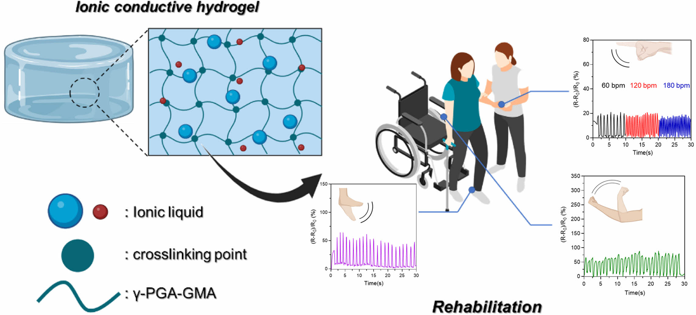 By introducing glycidyl methacrylate (GMA) modified poly(γ-glutamic acid)(γ-PGA) and an ionic liquid, a photocrosslinked hydrogel type strain sensor with excellent conductivity was prepared. It can be stretched to measure human motion and can measure changes in the bending or stretching of fingers, elbows, and Achilles tendon, which are easily injured.