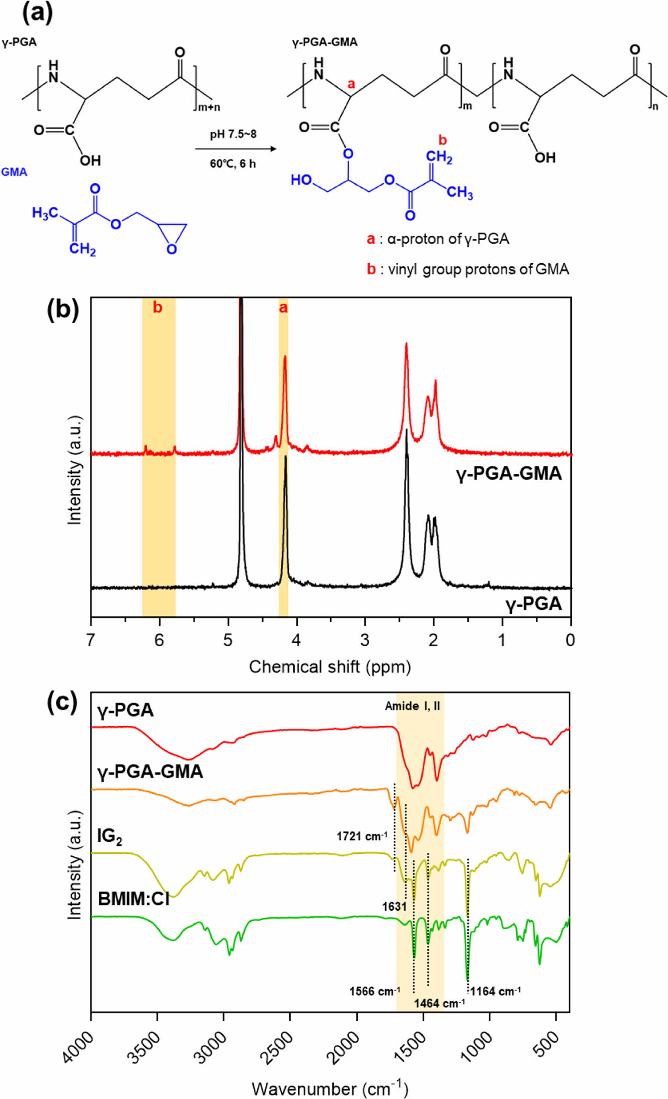 Figure 2 Synthesis of γ-PGA-GMA: (a) schematic of γ-PGA-GMA synthesis; (b) 1 H NMR spectrum; (c) ATR-IR spectrum of γ-PGAGMA. |
