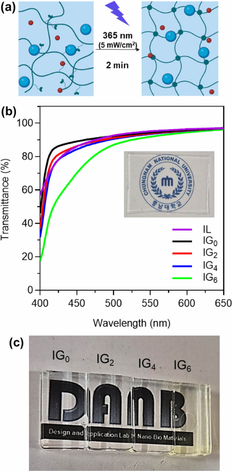 Figure 3 (a) light-mediated gelation mechanism γ-PGA-GMA hydrogel; (b) transmittance of IGX and IL in the visible-light region; (c) photographs of IGX above the letters. |