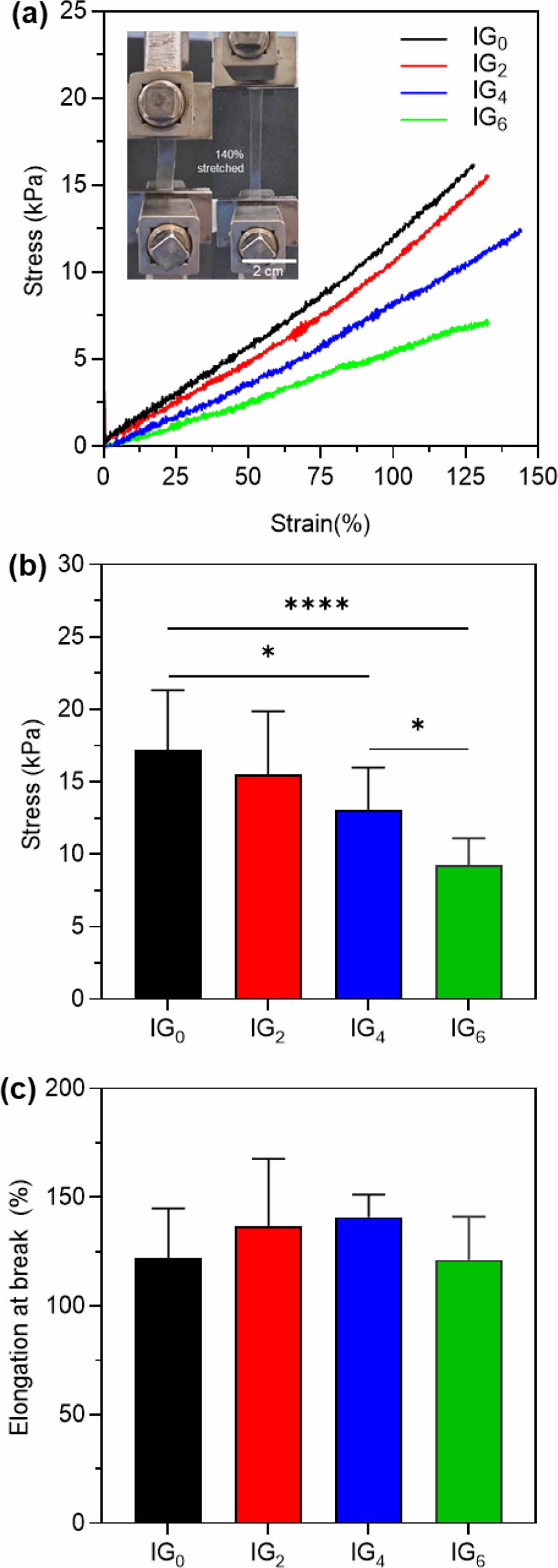 Figure 4 Mechanical properties of IGX: (a) stress–strain curves. IG4 can stretch 140%; (b) tensile strength; (c) elongation at break (n = 6) of each sample. |