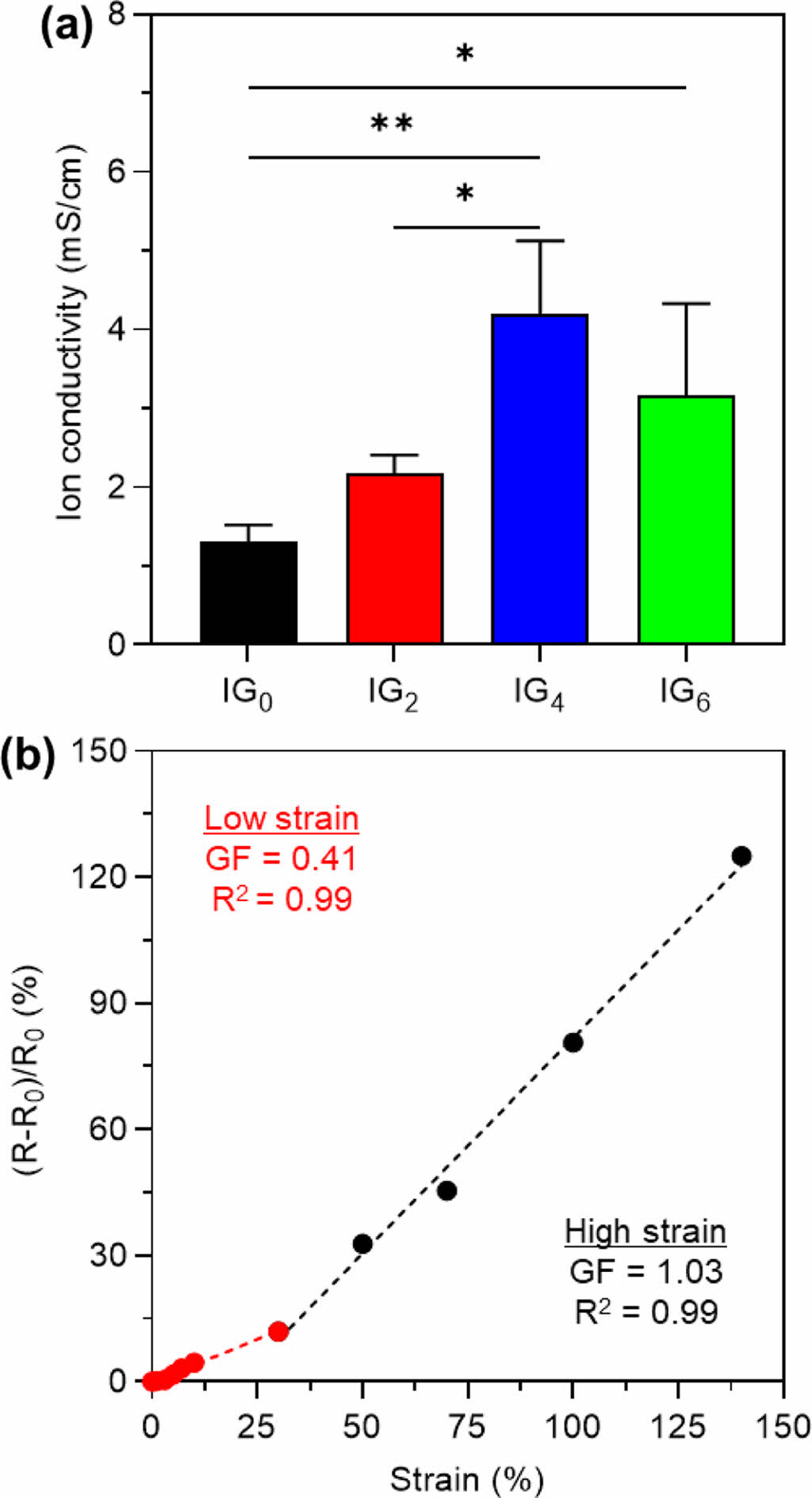 Figure 5 Electrical characteristics of γ-PGA-GMA hydrogel: (a) ion conductivity of IGx; (b) gauge factor result of IG4 hydrogel. |