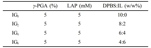 γ -PGA-GMA 이온전도성 수화젤의 제조. γ-PGA-GMA 기반 수화젤 및 이온성 수화젤은 광가교를 통해 제조하였다. 먼저, γ-PGA-GMA를 다양한 조성비를 갖는 DPBS와 IL(BMIM:Cl) 혼합용액에 용해시켰다. 이후, 5 mM LAP를 첨가한 뒤, 광조사를 통해 수화젤을 제조하였다(365 nm, 5 mW/cm2, 2 min). 수화젤의 내부 DPBS와 IL의 비율에 따라 각각 IG0, IG2, IG4 또는 IG6이라고 명명하였으며 자세한 조성은 아래 Table 1에 명시하였다.