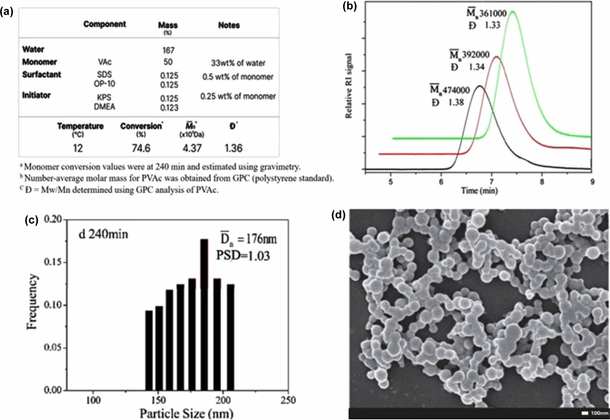Figure 1 (a) Emulsion polymerization condition of VAc; (b) GPC profiles for three representative samples of PVAc at 20, 50 and 80% conversion from right to left obtained; (c) size distribution of PVAc emulsion at 240 min using DLS; (d) SEM images (×30000) of PVAc particles. Reproduced with permission from Ref. 28, Guan, Y. et al., Polym. Int., 2016, 65, 1382-1386. ©2016, Wiley |