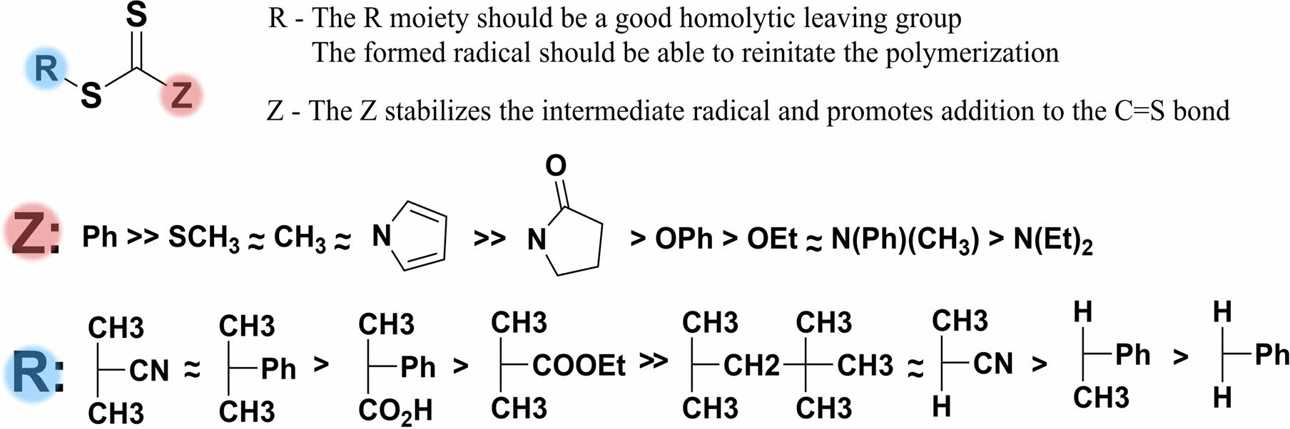 Figure 3 Representative substituents of RAFT agents and their reactivity. |