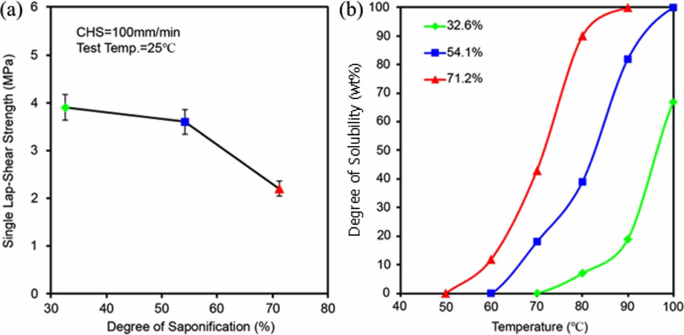 Figure 5 (a) Single lap-shear strength of hot-melt adhesive as a function of the degree of saponification; (b) degree of water-solubility of LMW PVAc specimens having different degrees of saponification. Reproduced with permission from Ref. 89, Kim, Y. H. et al., Mater. Res. Express, 2020, 7, 075301. ©2020, IOPscience. |
