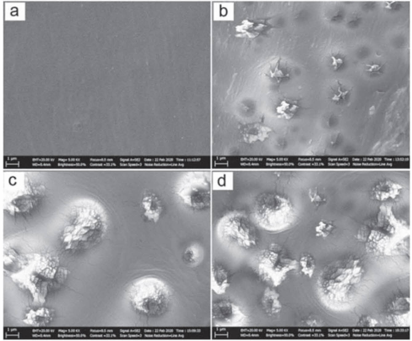 Figure 6 The surface morphology of the hot-melt adhesive with the degree of saponification of 54% after: (a) 0 day; (b) 1 week; (c) 1 month; (d) 3 months (scale bar = 1 μm). Reproduced with permission from Ref. 89, Kim, Y. H. et al., Mater. Res. Express, 2020, 7, 075301. ©2020, IOPscience. |