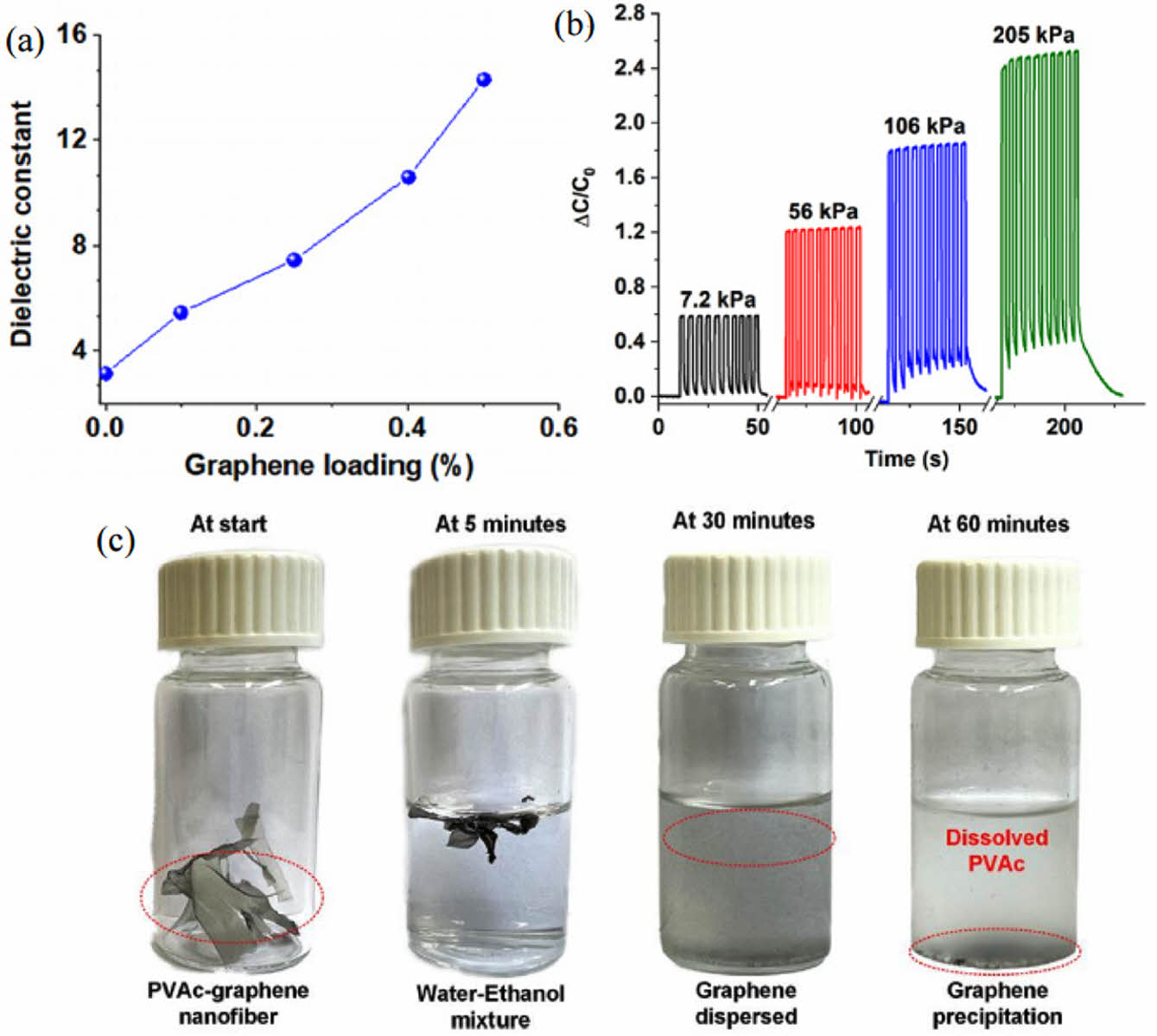 Figure 9 (a) Plot showing the dielectric constant to graphene loading; (b) plot showing the normalized capacitance change responses of the 0.25 wt% graphene−PVAc pressure sensor for 10 cycles of four different uniaxial pressures (7.2, 56, 106, and 205 kPa); (c) photographs showing the degradation of the 0.25 wt% graphene−PVAc nanofibrous membranes at different points in time. Reproduced with permission from Ref. 105, Sengupta, D. et al., ACS Appl. Mater. Interfaces, 2023, 15, 22351-22366. ©2023, American Chemical Society |
