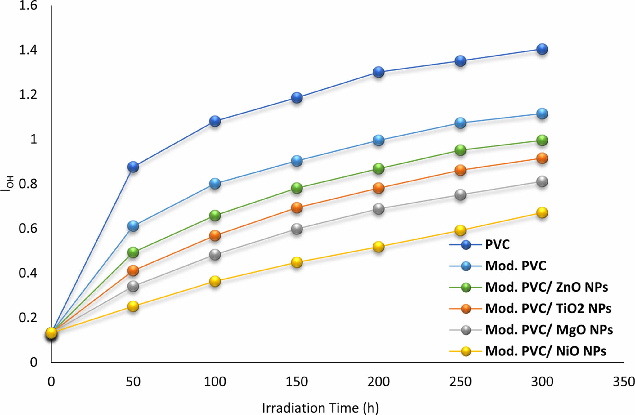 In order to determine the relationships of IOH, IC=O, and IC=C values with irradiation time, they were plotted in Figures 2–4. From the figures, the growth rate of polyene, carbonyl, and hydroxyl groups enhanced as the irradiation time increased, and lowered after the filling of NPs.