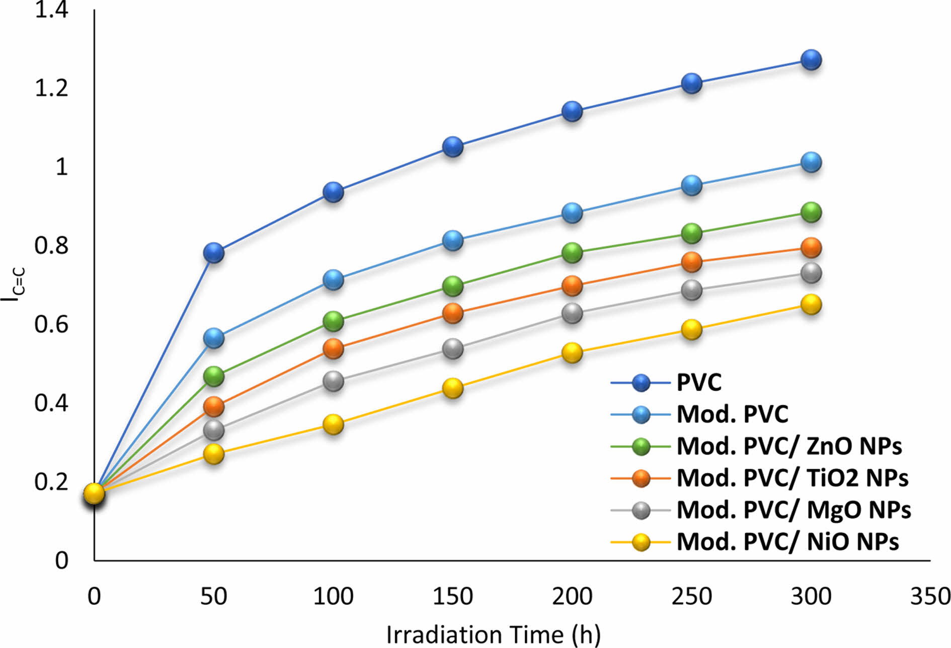 Irradiation of PVC Films by UV Radiation. The plain, chemically modified, and NP-filled PVC films were subjected to UV light irradiation with a wavelength of 365 nm and a light source intensity of 1.052 × 10−8 ein·dm−3·s−1 at a temperature of 25 ℃ for a duration of 300 h. This experiment was performed to examine the films' ability to withstand photodegradation and determine the improvement produced by adding metal oxide nanoparticles.