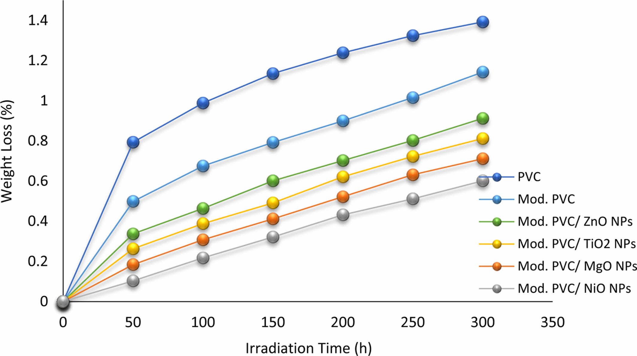 The photo-oxidation process of PVC involves dehydrochlorination, which entails the removal of HCl. This process also exposes volatile organic residues, resulting in weight loss.28 In this experiment, irradiation was performed at regular intervals of 50 hours, and the weight reduction was tracked by applying Equation (2). Figure 5 illustrates the influence of UV radiation on the PVC films. Among all PVC films, the modified PVC film containing NiO NPs showed the least weight loss.