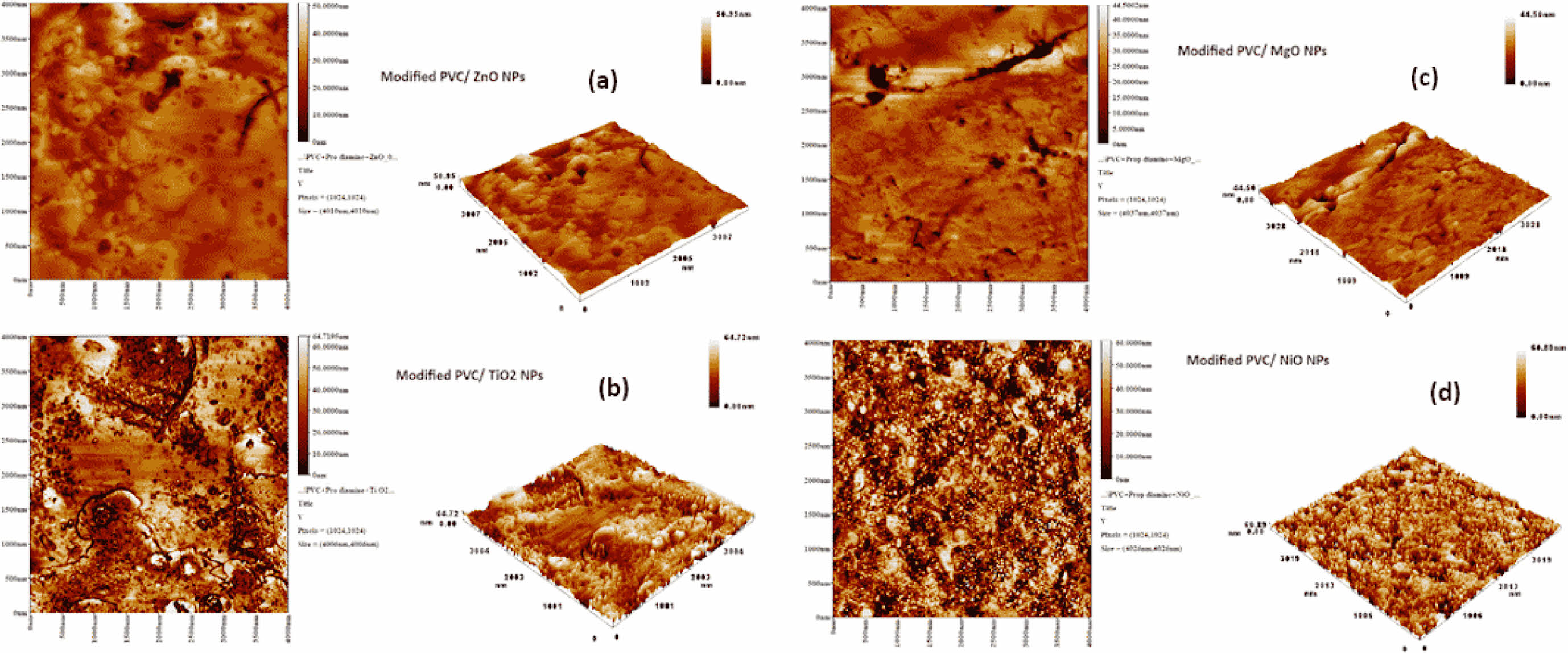 AFM images of NPs-modified PVC films: (a) ZnO; (b) TiO2; (c) MgO; (d) NiO.