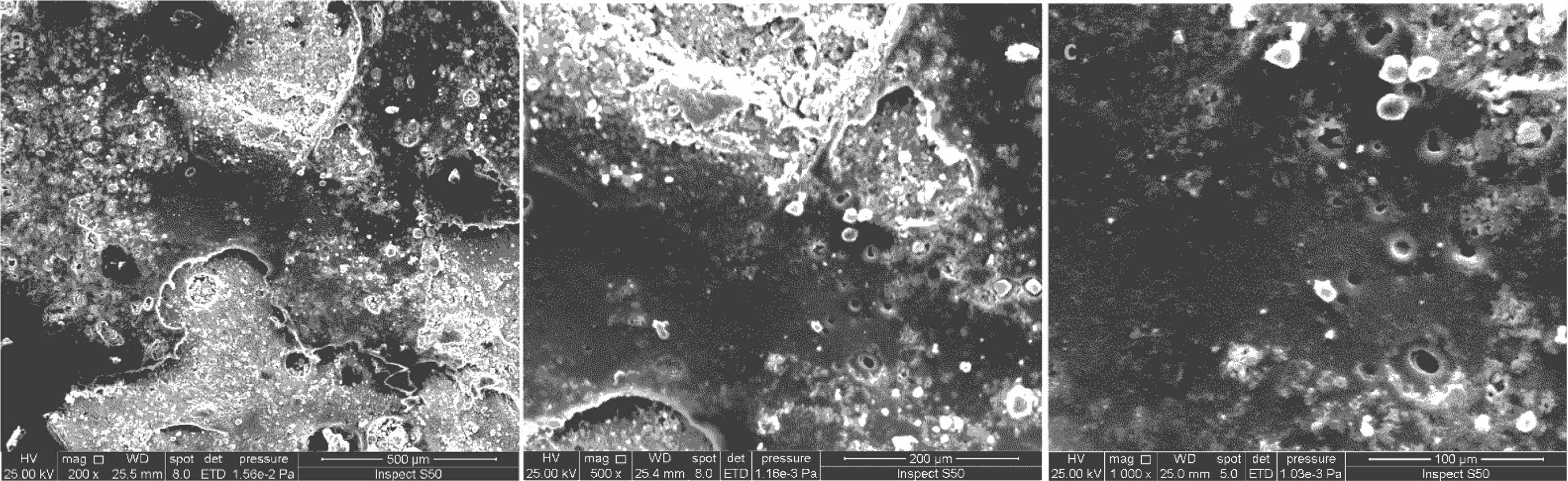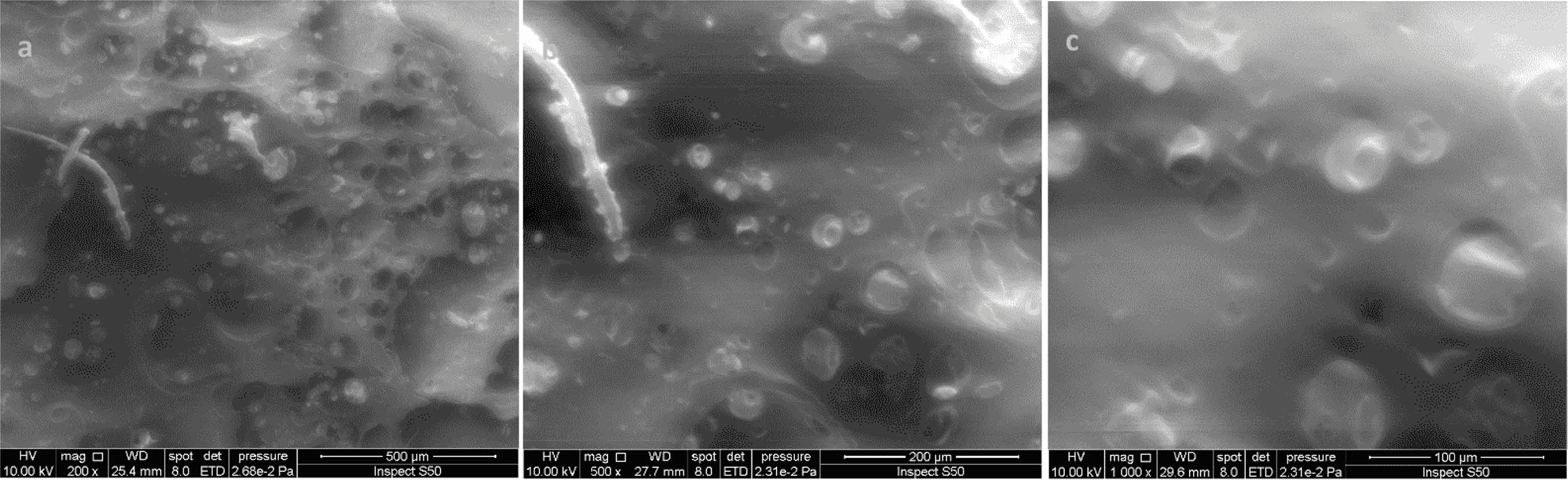 SEM Testing: To obtain high-resolution images of the polymeric film morphology, the SEM technique was utilized.30 SEM images at three magnification levels illustrate the impact of irradiation on the plain, modified, and NPs-filled PVC films are shown in Figures 8, 9, and 10-13, respectively. Compared to the irradiated blank PVC film, the surface of the modified and NPs-filled PVC films displayed a smoother and cleaner appearance. The modified PVC films exhibited distinct morphological surfaces due to the presence of particles, which may appear as pores. The morphology of the modified PVC films revealed a honeycomb-like structure, incorporating ZnO, TiO2, MgO, and NiO NPs. Fig. 11  Fig. 12