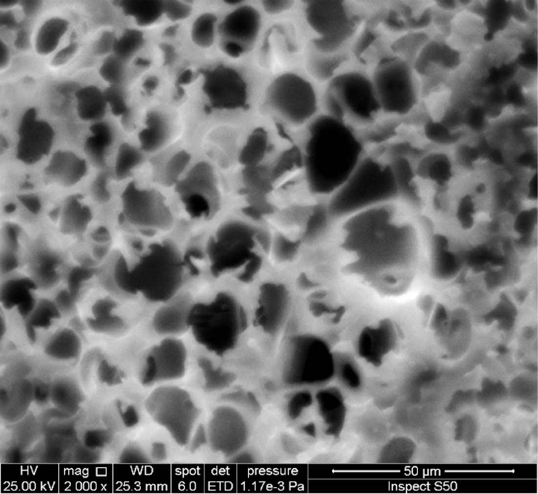 A sponge-like structure is a common shape observed in the sub-layers of membranes, as shown in Figure 13.31-33 There are two distinct forms of sponge-like structures: one is the interconnected network type, and the other is a closed-cell type consisting of isolated individual cells. A perfect asymmetric membrane consisting of a thin outer layer and a porous inner linked structure are observed. The extensive interconnection of the porous substructure, while difficult to measure precisely, is essential for reducing resistance to the movement of mass.32 This structure is favored because of its exceptional mechanical merits in comparison to other structures.33