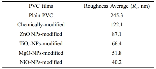 Modifying polymer surfaces directly can change the diameters of pores and the level of porosity, which has the potential to improve the performance of polymeric membranes.23 This work aimed to enhance the performance of PVC films by modifying them using propylene di-amine and four metal oxide nanoparticles NPs, namely: TiO2, ZnO, MgO, and NiO. The examination included the exposure of the prepared films to 365 nm UV radiation. The morphological and physicochemical characteristics of the plain, chemically modified, and NPs-filled films were analyzed using several examination methods, all of which confirmed the efficacy of these additives to work as stabilizers in different degrees for PVC polymer.