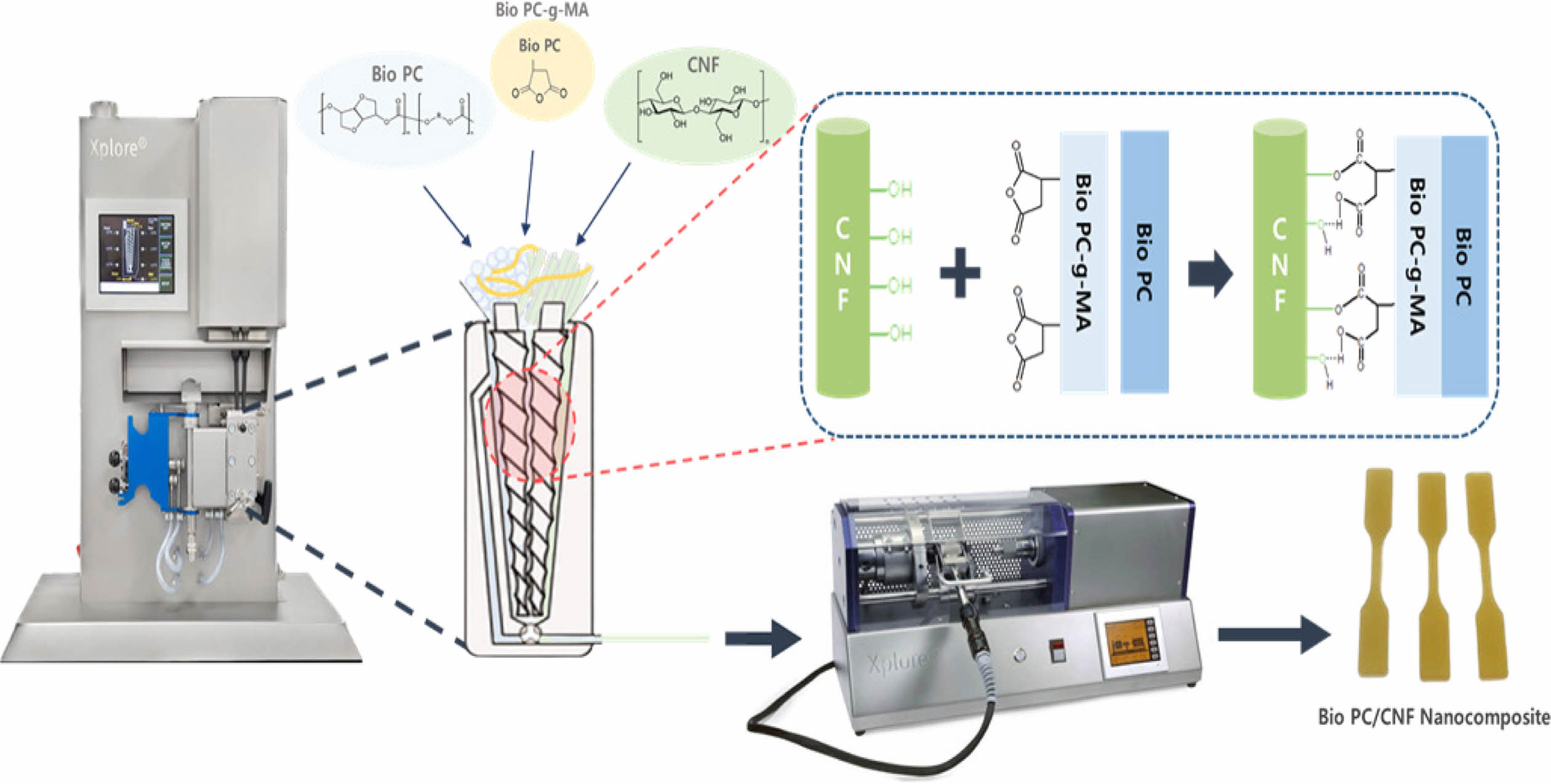 Bio PC–g–MA 상용화제 제조. Bio PC와 CNF의 계면 접착력 및 CNF의 분산성 향상을 위해 반응압출 공정에 의한 그라프트 반응울 통해 Bio PC-g-MA 상용화제를 제조하였다. 상용화제 제조를 위해 twin screw가 수직으로 설치되어 있고, Volume 5 mL인 batch type의 micro compounder injection molder(Xplore MC5, Xplore, Netherlands)을 이용하여 반응 압출하였다. Co-Rotation 방식이며, 온도는 상부 190 ℃, 중부 190 ℃, 하부 190 ℃로 설정하였고, 체류시간 5분, Screw 속도 100 rpm으로 충분한 반응시간을 주어 필라멘트 형태의 Bio PC-g-MA 상용화제를 제조하였다. 미반응 MA는 아세톤 500 mL에 용해시켜 제