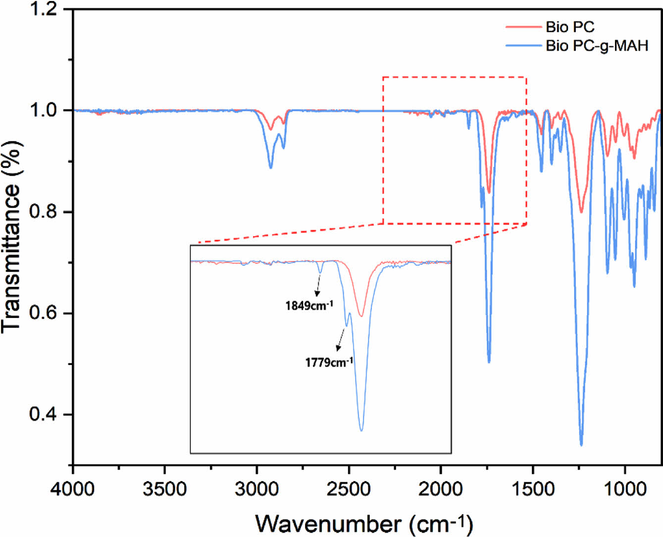 Bio PC–g–MA 상용화제 특성 분석. 반응압출 공정에 의해 제조된 Bio PC-g-MA 상용화제의 그래프팅 유무를 확인하기 위하여 FTIR(Hyperion 2000 microscope, Bruker, USA) 장비를 이용하여 ATR 모드로 resolution 4 cm-1 조건 하에서 샘플당 32회 분석을 수행하였다. FTIR 분석을 위해 hot press (WL1600M, WITHLAB, Korea)를 사용하여 필름 형태의 시편을 제작하였으며, 상∙하부 가열판의 온도는 210 ℃로 설정하였다.
