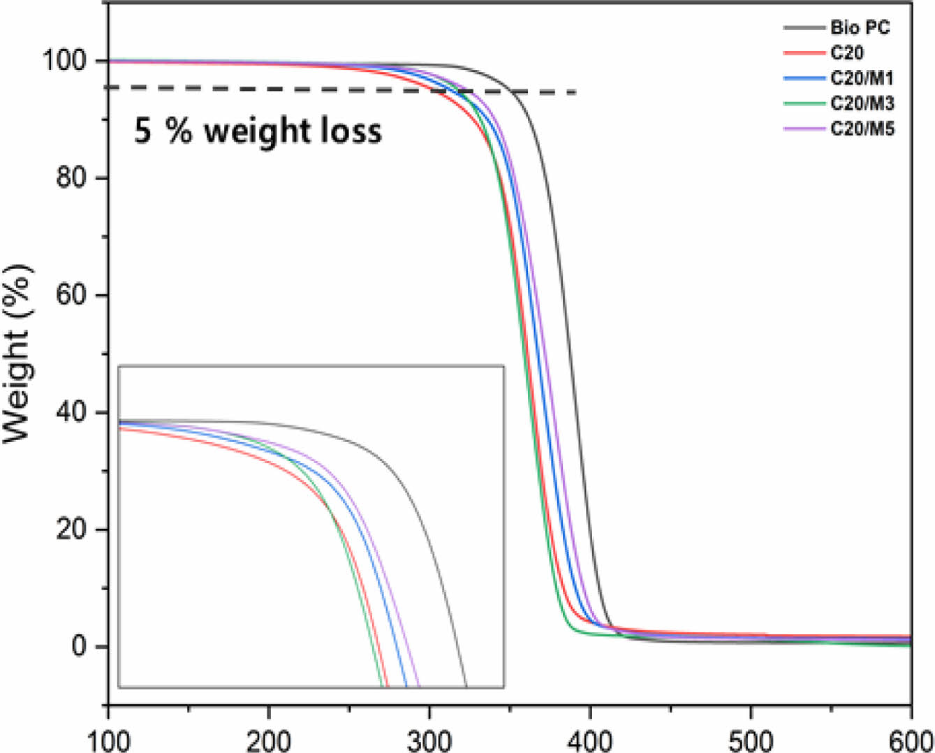 Bio PC/CNF 나노복합체 열특성 분석. Bio PC/CNF 나노복합체의 내열성 변화를 확인하기 위하여 TGA(TGA 550, TA Instrument, USA)를 이용하였다. 질소 분위기 하에서 20 ℃/min의 승온속도로 온도 범위 30-700 ℃까지의 열분해 거동을 측정하여 무게 감소율 5%에서 열분해 온도를 비교하여 내열성을 평가하였다.