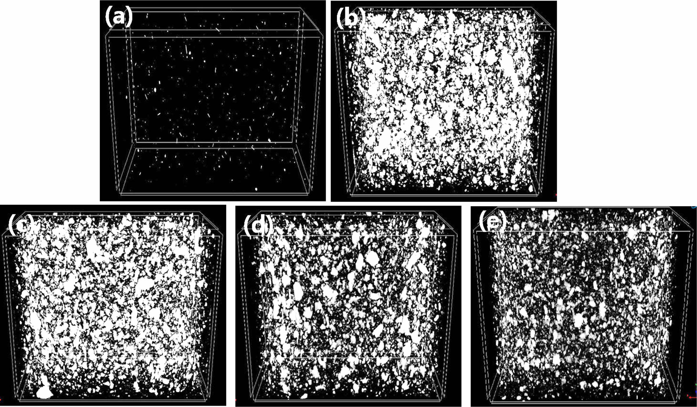 Figure 7 X-ray 3D CT images of the Bio PC/CNF nanocomposite: (a) Bio PC; (b) C20; (c) C20/M1; (d) C20/M3; (e) C20/M5. |