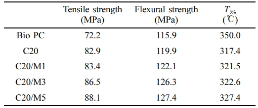 Bio PC/CNF 나노복합체 기계적 물성 분석. Bio PC/CNF 나노복합체 내의 CNF 분산성 개선을 통한 물성 향상 효과 확인을 위해 CNF 함량을 20 wt%로 고정하여 복합체를 제조하였고, 앞서 제조한 Bio PC-g-MA 상용화제를 첨가하여 기계적 물성을 비교하여 측정 값을 Table 3에 나타내었다. Figure 3, 4는 Bio PC/CNF 나노복합체의 인장강도, 굴곡강도를 측정한 그래프이다.