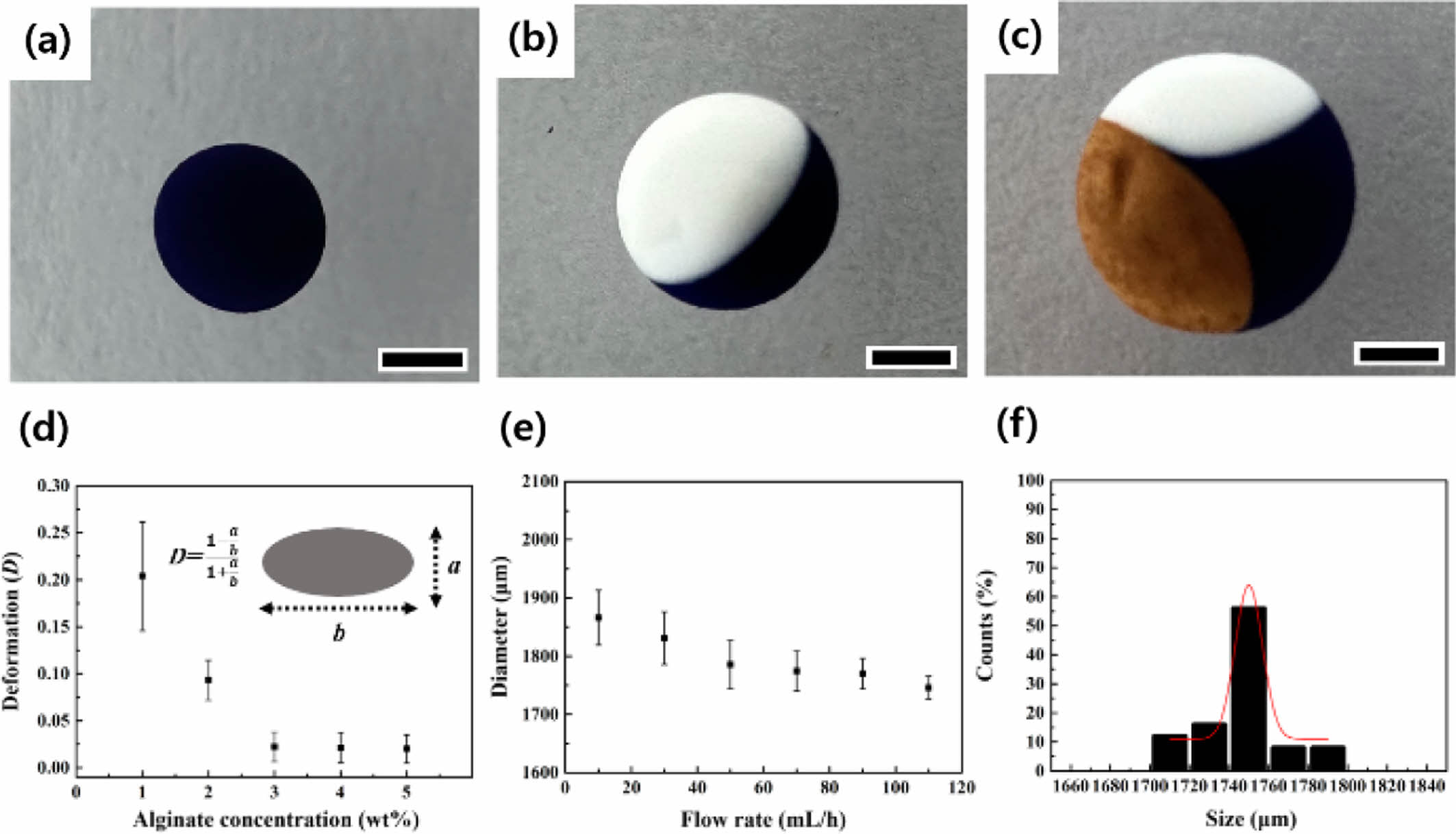 Figure 2 Generation of various adsorbents by syringe pump using programmed on and off sequences: (a) single-; (b) bi-; (c) tri-compartment adsorbents loaded with PB (blue), HA (white), and MNP (brown). The scale bars represent 500 μm. Relationship between physical characteristic and control values such as; (d) alginate concentration; (e) precursor injection speed; (f) the size distribution showing PB-HA-MNP adsorbents. The C.V. values are being less than 3%. |