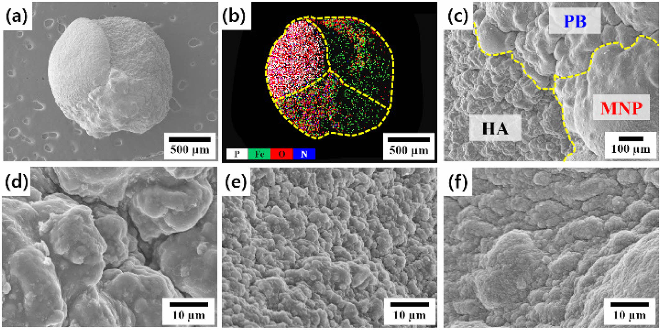 Figure 3 Morphological characterization of multifunctional adsorbent: (a) SEM image and its corresponding; (b) elemental mapping composite image showing distributions of different functional nanoparticles. SEM images of the interface of PB-HA-MNP adsorbent; (d) PB-; (e) HA-; (f) MNP- encapsulated compartments at high magnification. |