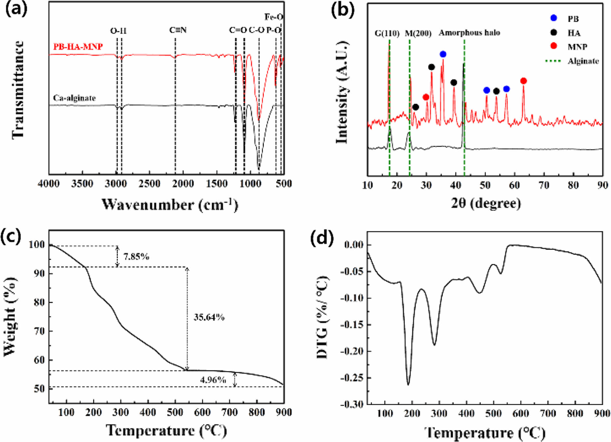 Figure 4 (a) FTIR spectra of the PB-HA-MNP adsorbent, in which red and dark indicate single adsorbent and Ca-alginate particle, respectively; (b) X-ray diffraction spectra of each compartment in multifunctional adsorbent; (c) TGA curve; (d) DTG curve for fabricated PB-HAMNP adsorbents. |