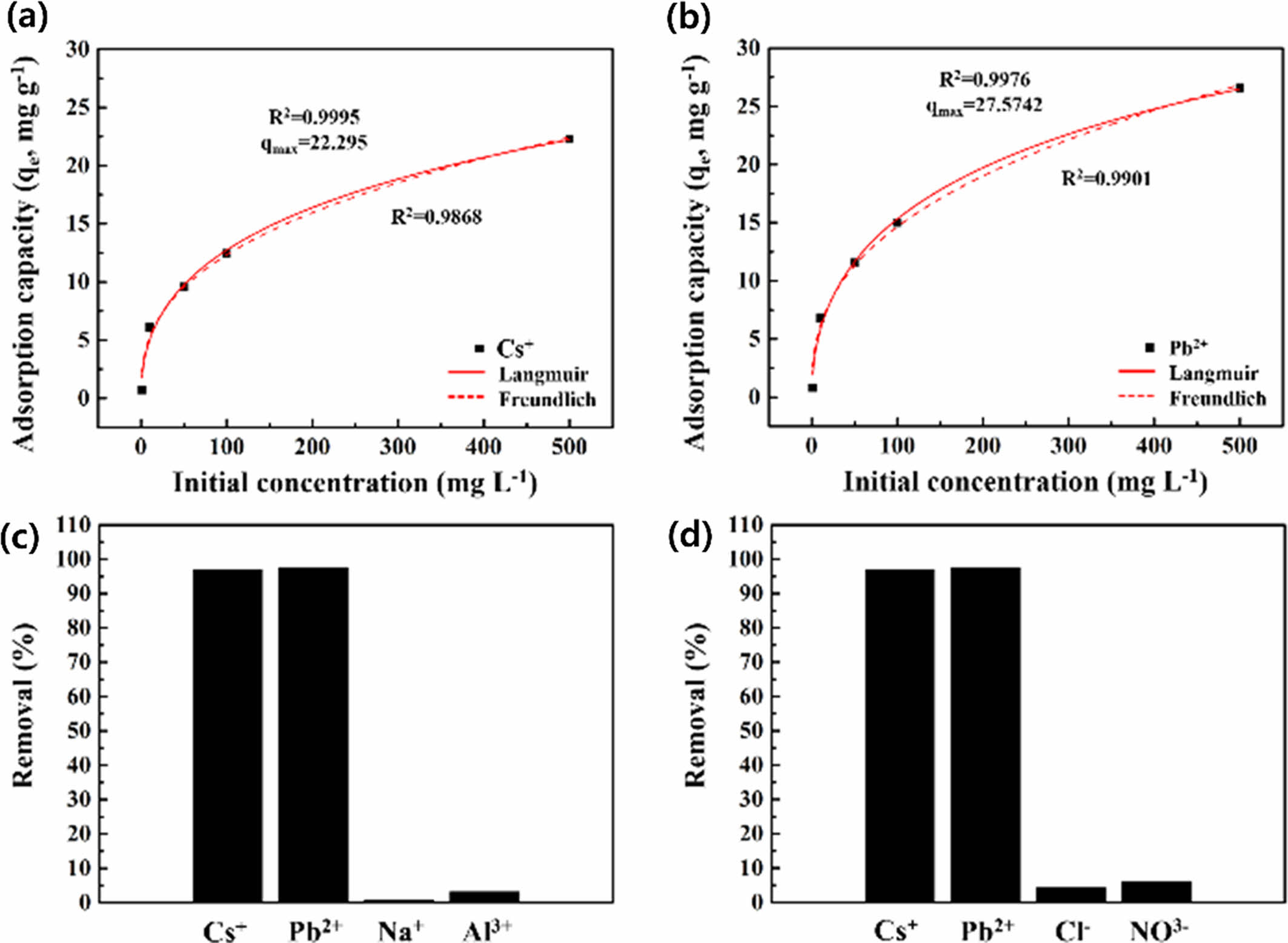 Figure 5 Simultaneous removal of cesium and lead. Adsorption isotherm: (a) cesium; (b) lead. Selective adsorption capacity from artificial contaminated water including various; (c) cations; (d) anions. |