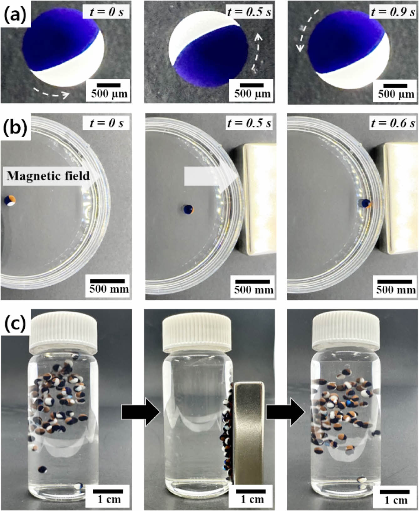 Figure 6 Time-sequential images of magnetic actuation showing: (a) spinning behavior; (b) straight-line movement of a single adsorbent; (c) Dispersion and collection of PB-HA-MNP adsorbents with and without the magnetic field. |