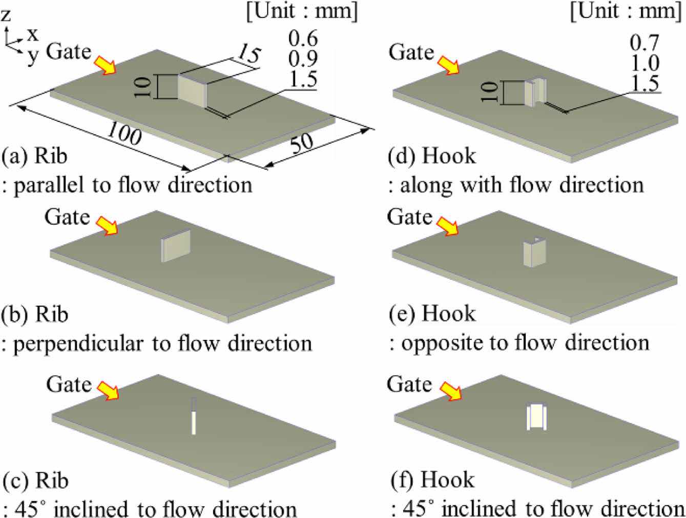 연구 모델. Figure 2에 시뮬레이션에 사용된 시편의 치수와 형상이 나타나 있다. 평판 시편의 길이는 100 mm, 폭은 50 mm이며 두께는 3 mm이다. 평판 시편의 두께 방향으로 돌출된 형상은 리브와 후크이다. 리브의 길이는 15 mm, 높이는 10 mm이며 두께는 각각 0.6, 0.9, 1.5 mm로 평판의 두께에 대하여 각각 20, 30, 50% 비율로 설계하였다. 후크의 높이는 10 mm이고 두께는 0.7, 1.0, 1.5 mm로 바닥면 두께에 대해 각각 23, 33, 50% 비율이다. 수지의 흐름과 돌출부가 만나는 각도의 영향을 관찰하기 위해 리브와 후크의 방향을 달리하여 평판 위에 배치하였다. 리브는 수지의 흐름과 평행한 방향(Figure 2(a)), 흐름과 직각 방향(Figure 2(b)), 그리고 흐름과 45o 방향(Figure 2(c))으로 각각 설계하였다. 후크는 후크의 꺾임 부분을 흐름 방향(Figure 2(d)), 흐름의 반대 방향(Figure 2(e)), 그리고 흐름과 45o 방향(Figure 2(f))으로 각각 설계하였다.