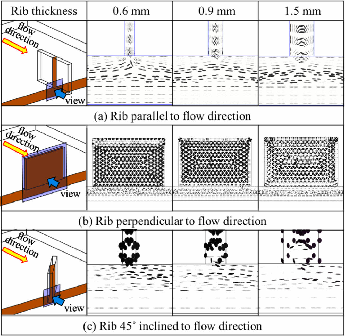 Figure 4 Effect of flow directions and thickness on the orientation of flake at the center of the rib. |