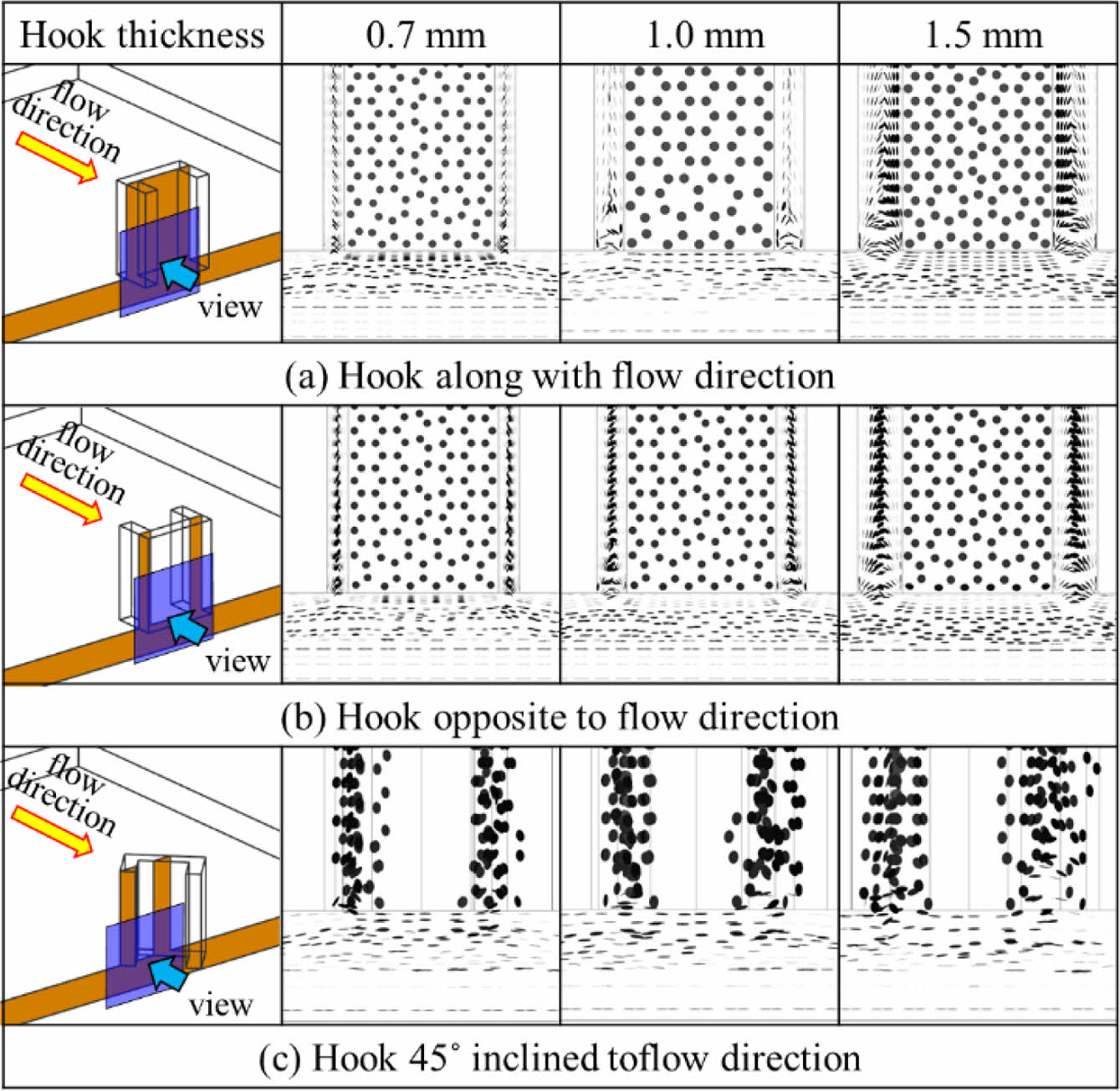 Figure 13 Flowline induced by different direction and thickness of hook. |